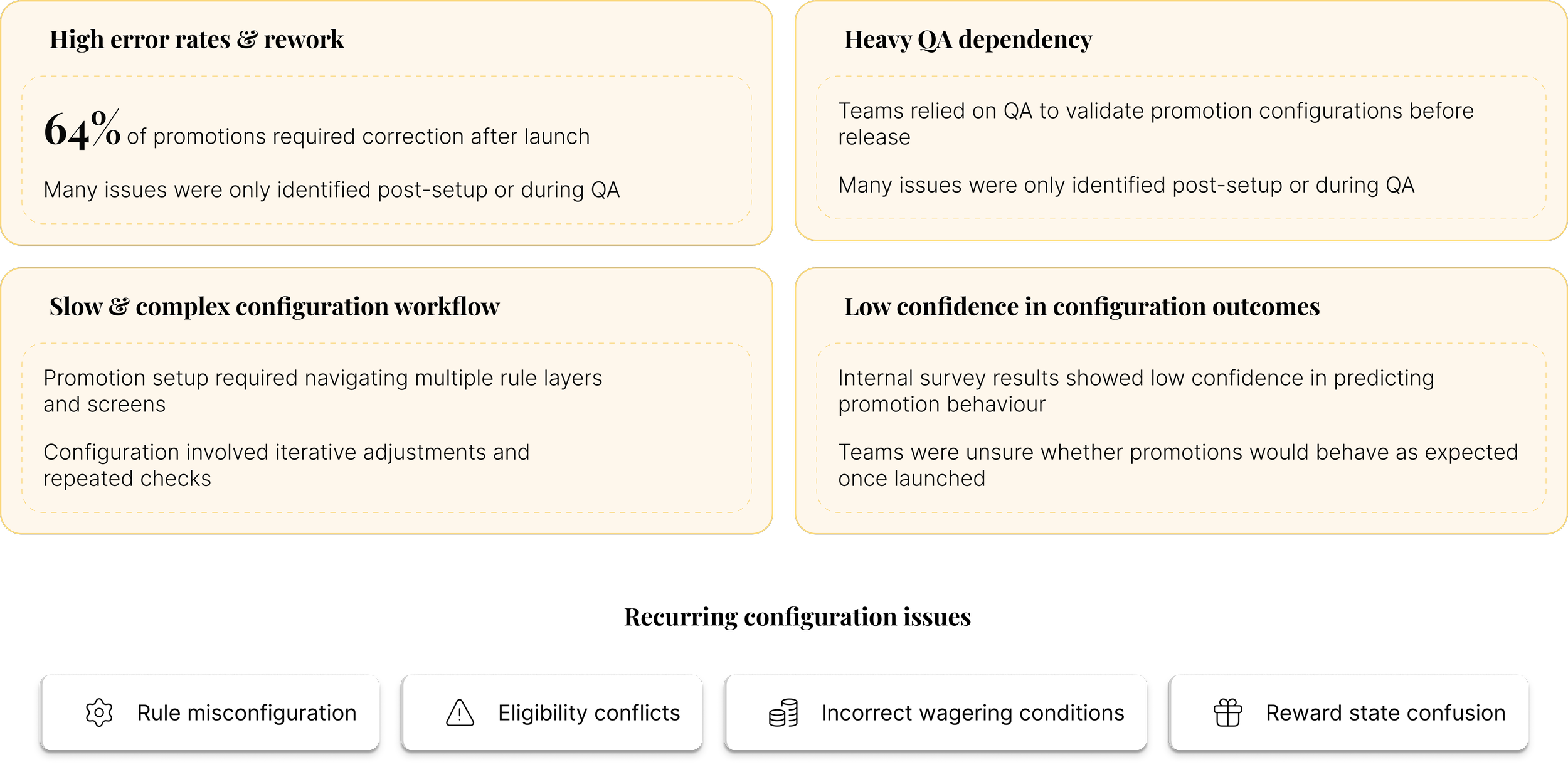 These signals suggested that the core issue was not just usability, but a lack of system clarity and predictability in how promotions were configured and validated.