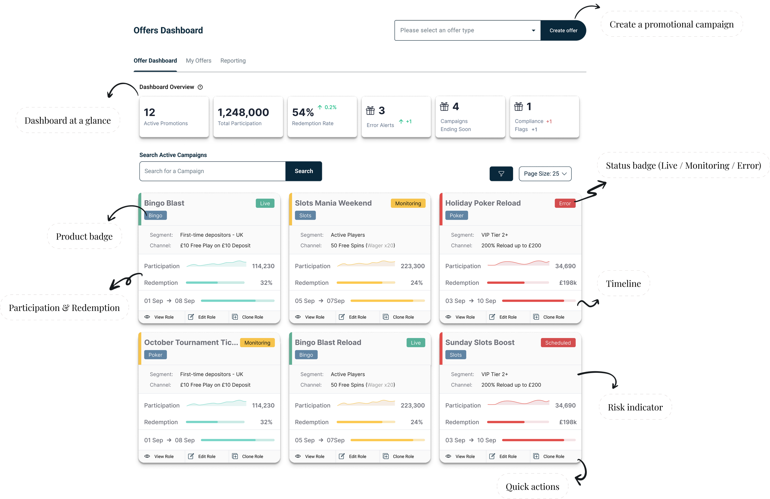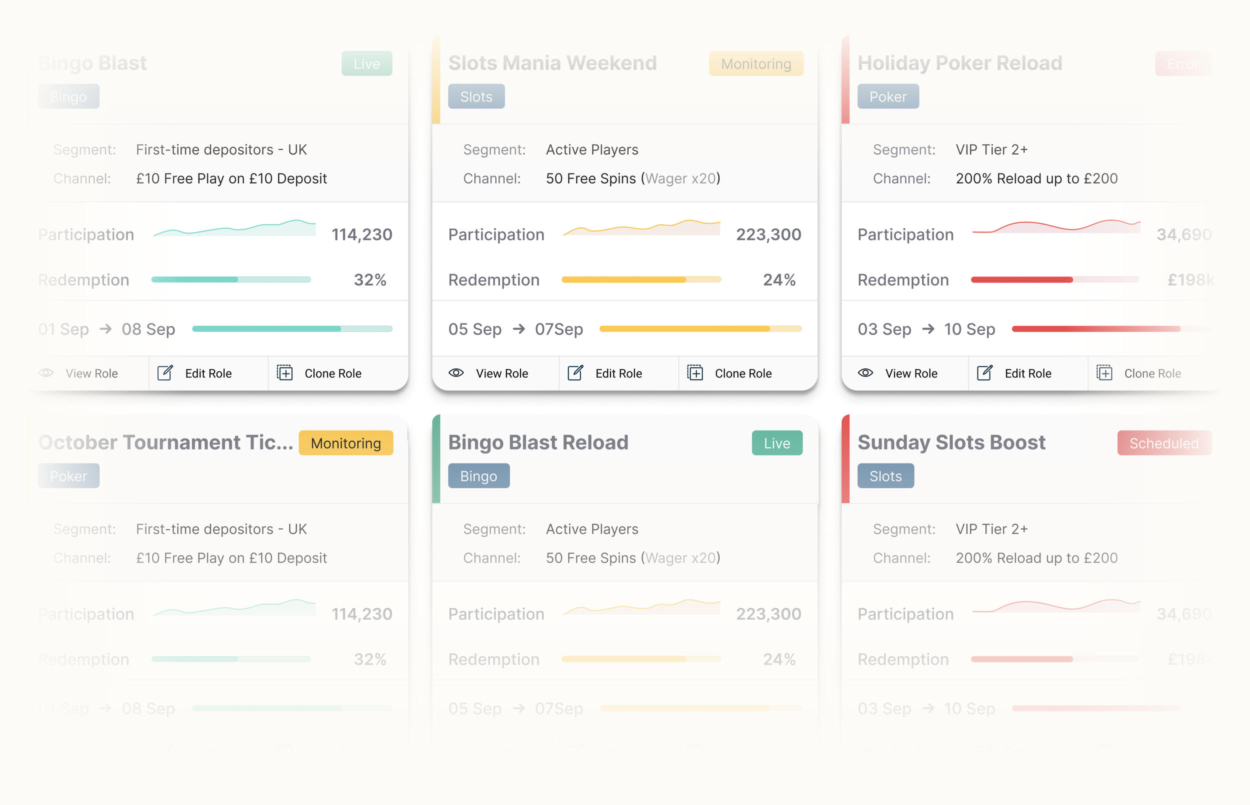 A card-based layout surfaces key campaign details such as reward type, status, and activation windows, making promotions easier to scan.