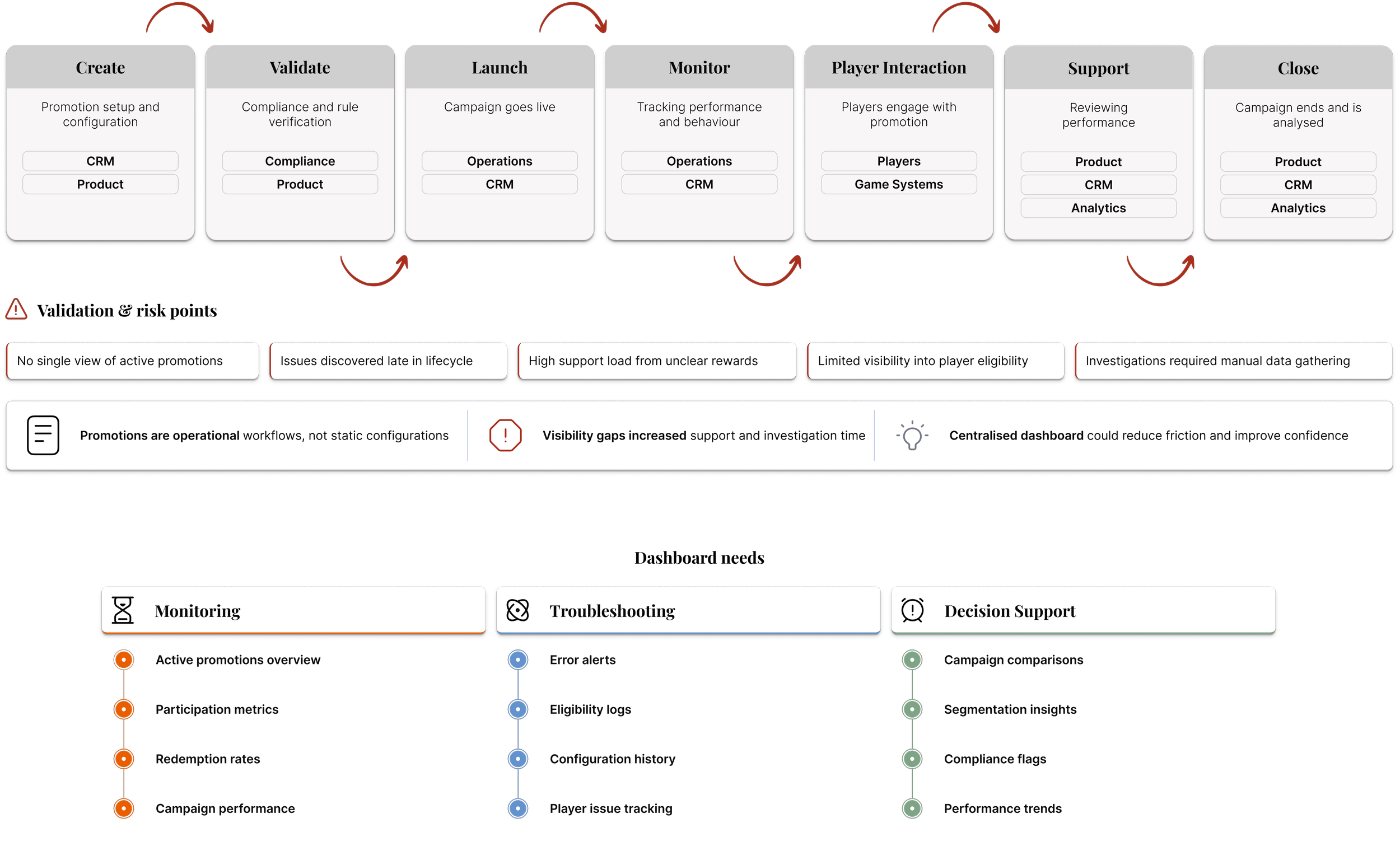 What it does: based on user interviews and workshops, the end-to-end lifecycle of a promotion was mapped from initial setup through validation, launch, monitoring, and closure.