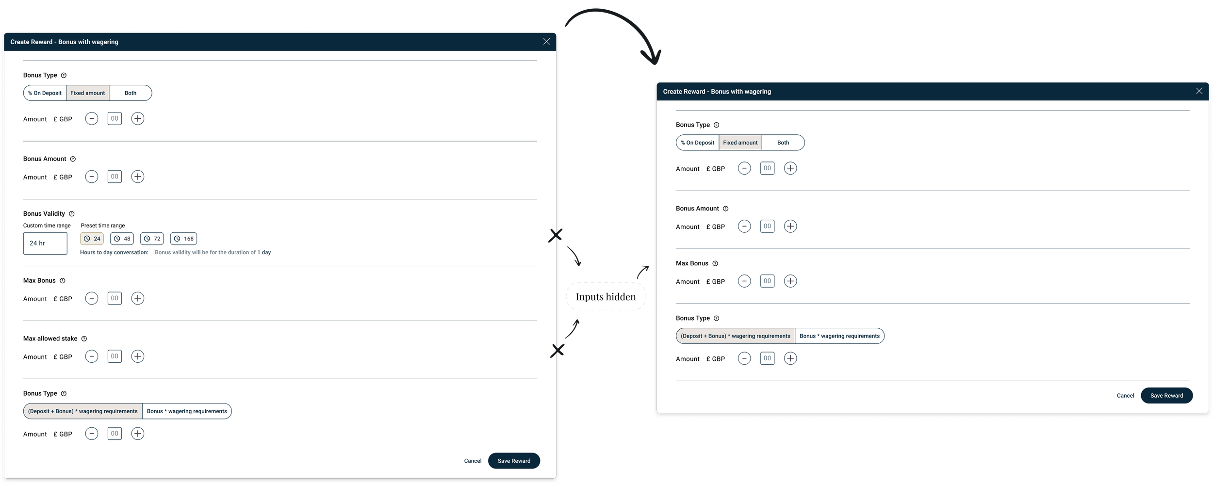 Selections such as reward type, eligibility rules, and deposit conditions automatically adjust the available reward parameters.