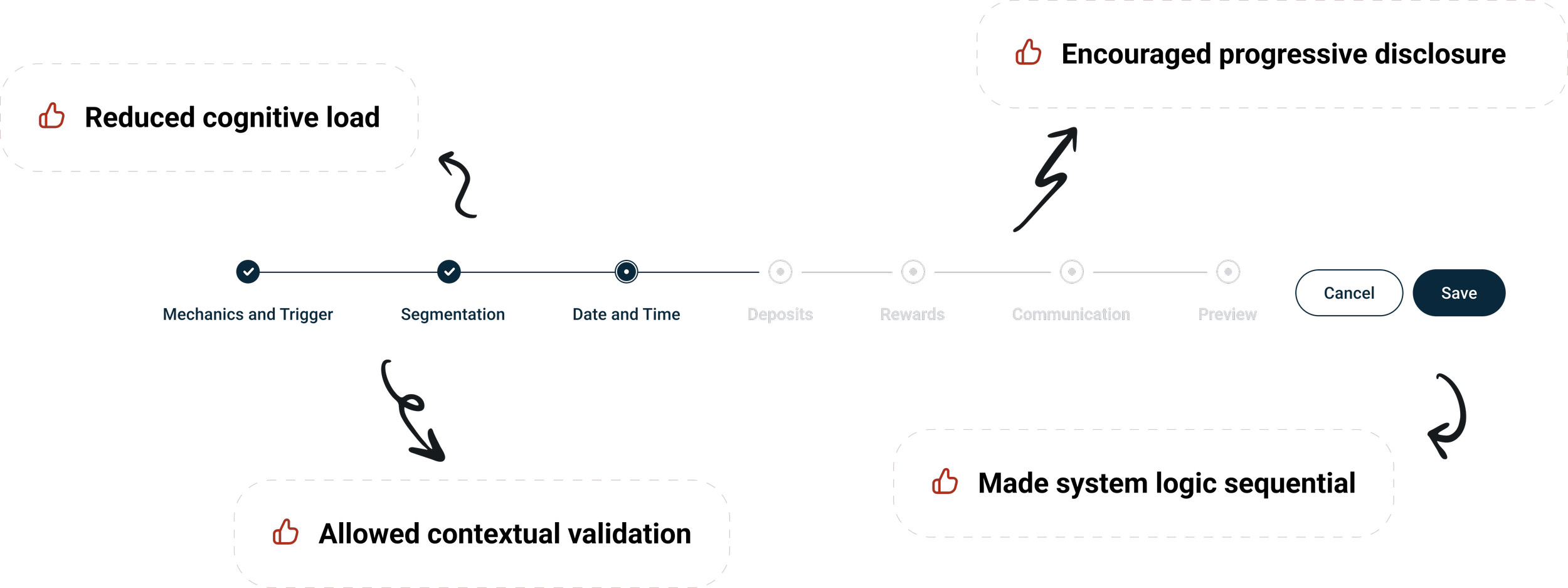 This flow was designed to make the rules engine transparent and guide users through safe and effective promotion setup.