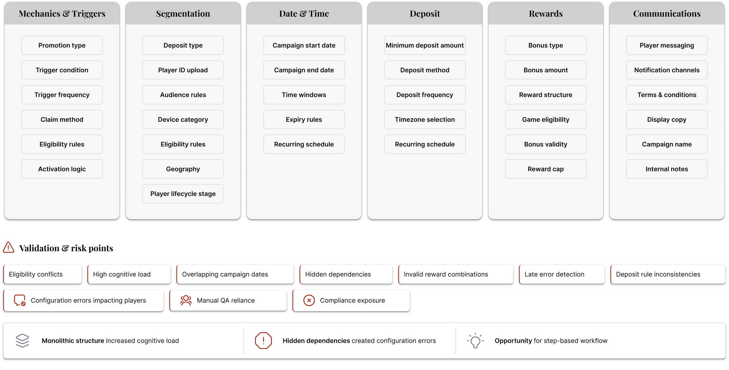 A structured discovery phase was conducted to break down how promotions were configured, validated, and managed across teams.