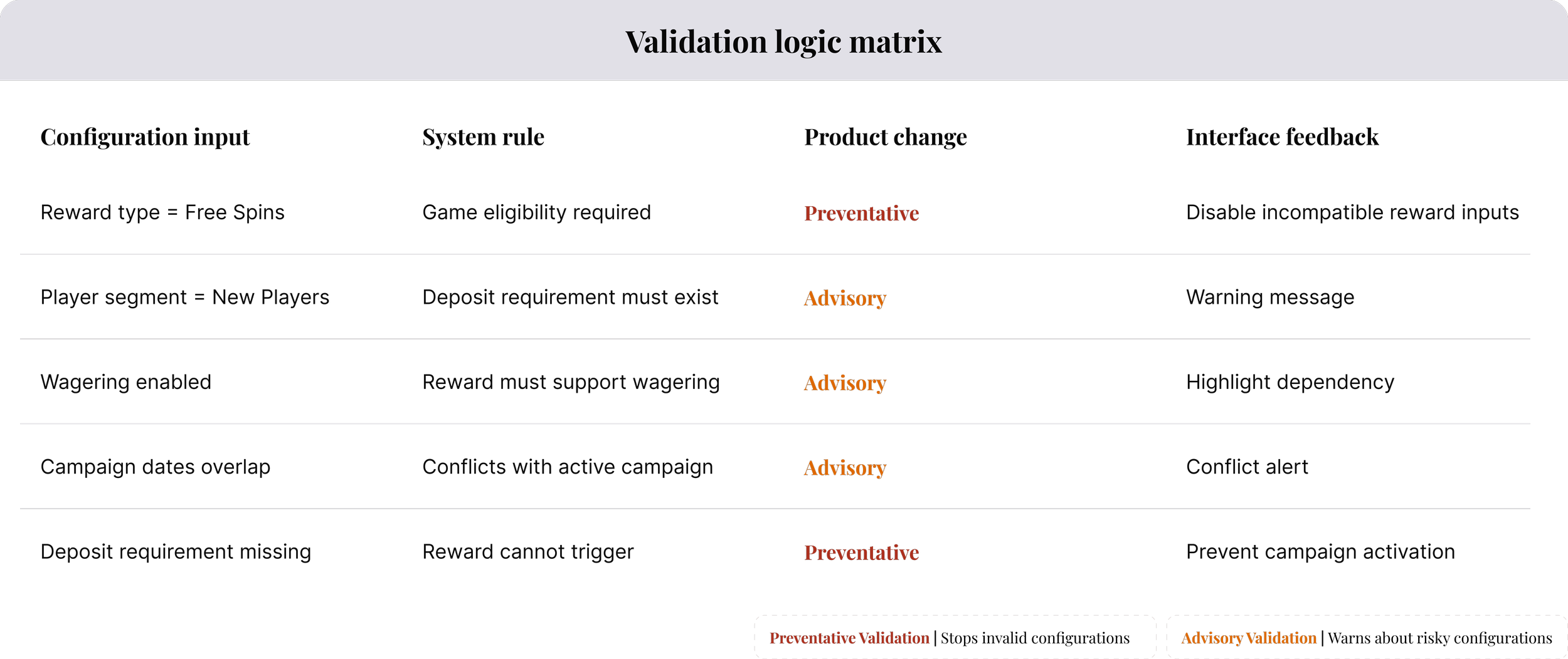 To address this, validation behaviour was mapped using a validation logic matrix, defining how the system should respond to rule conflicts, missing dependencies, and risky configurations.