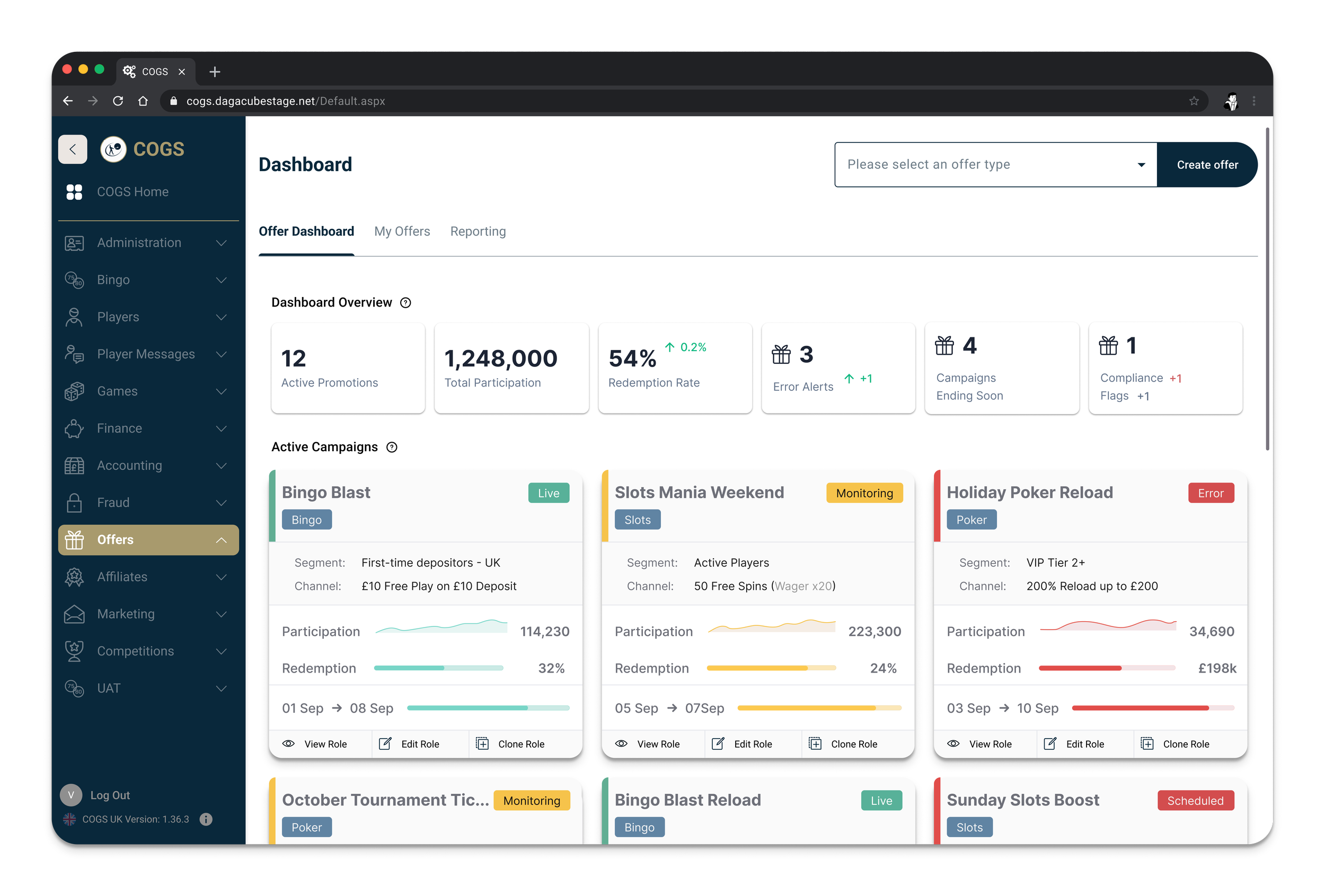 A card-based layout surfaces key campaign details such as reward type, status and activation windows, making promotions easier to scan.