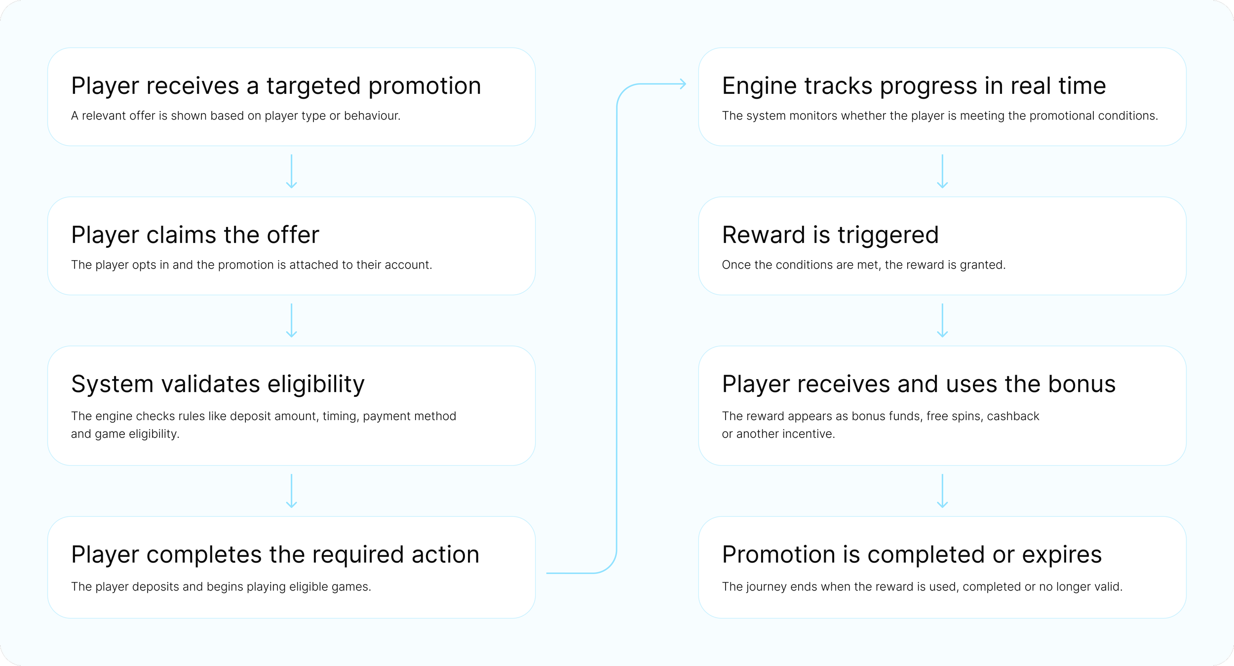 A bonus engine is the system in the background that decides who sees a promotion, who is allowed to claim it, what rules apply and when the reward should be given.