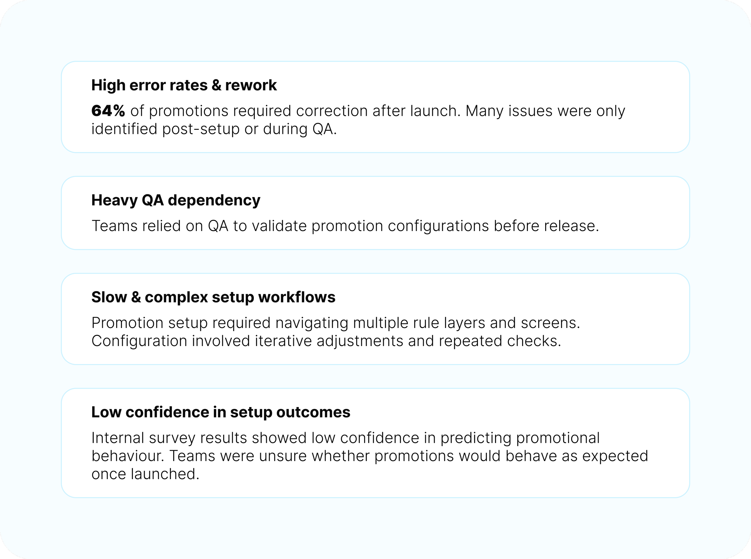 Discovery showed that promotion configuration was difficult to understand because rule dependencies were hidden, configuration decisions were scattered across a large form, and validation relied heavily on manual QA.