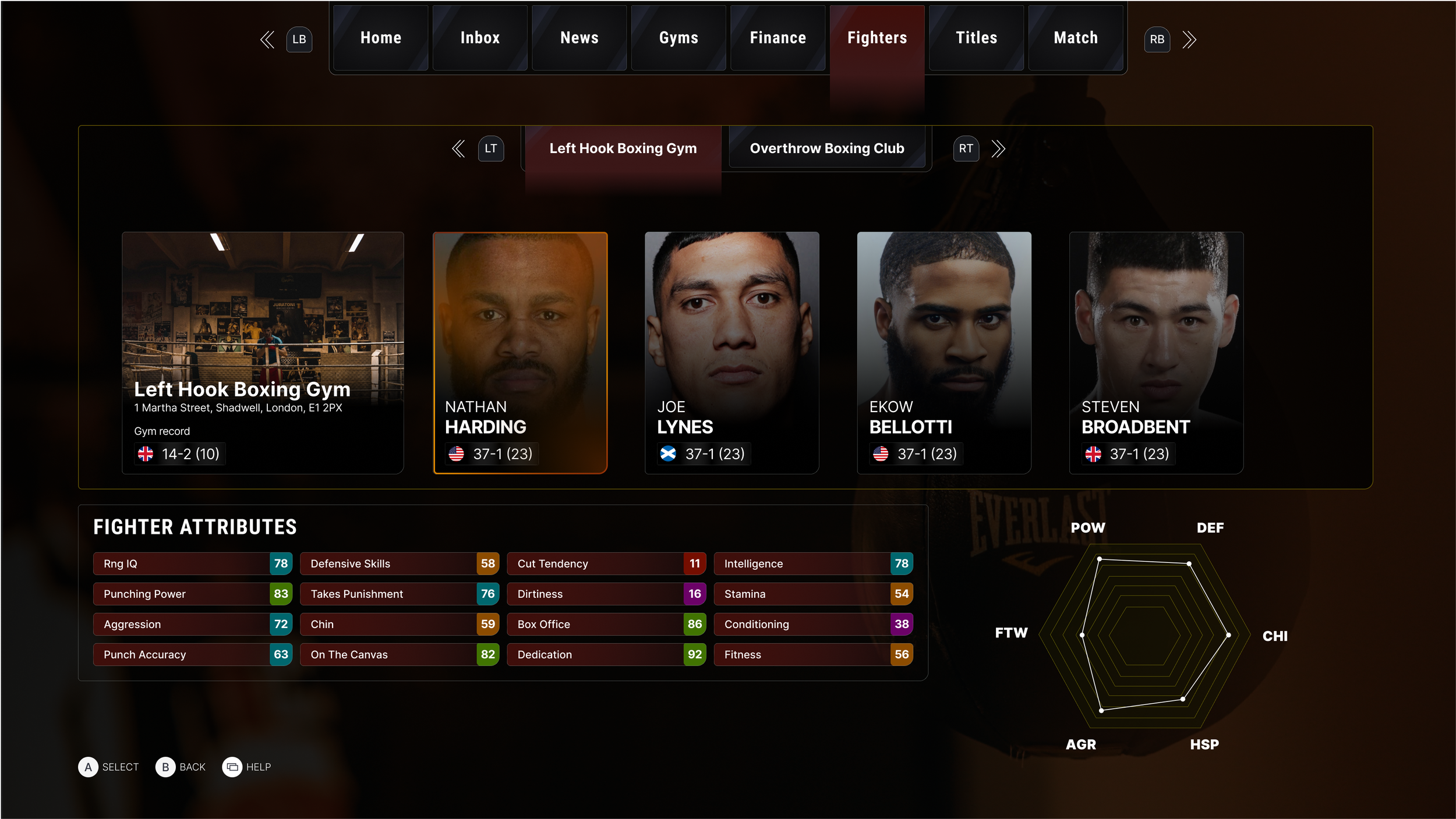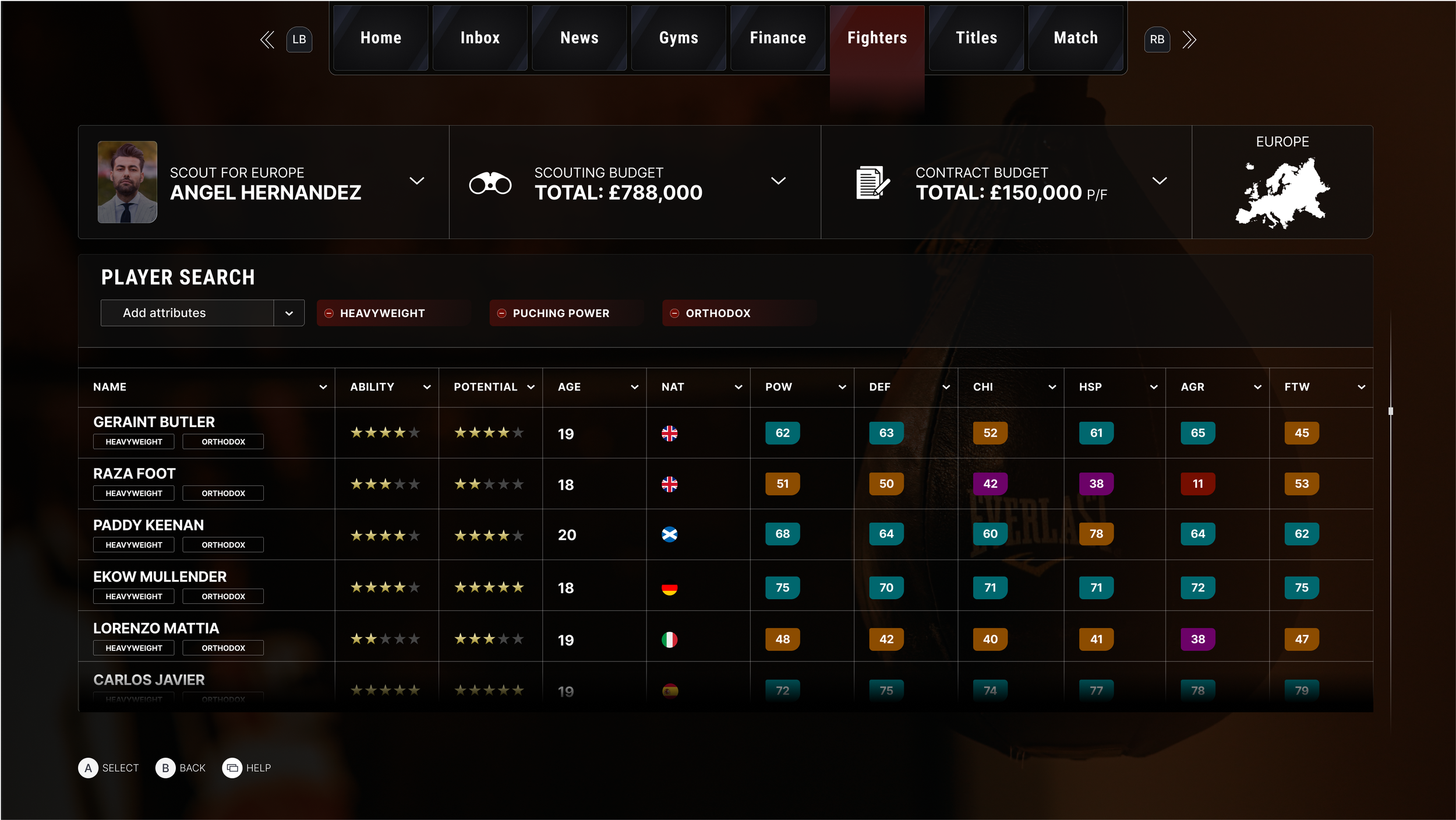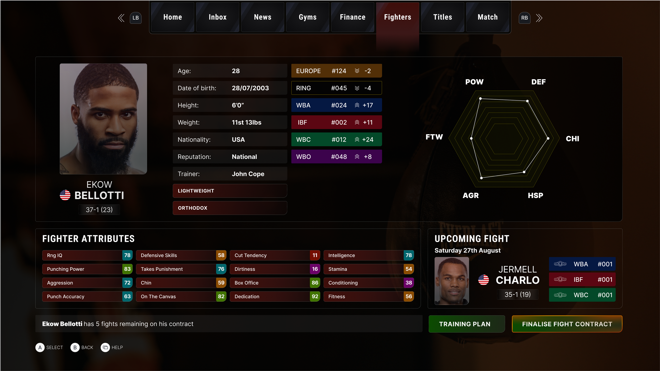 The user is able to view the chosen fighters' stats along with actions they can take such as setting a training plan or contract negotiations.