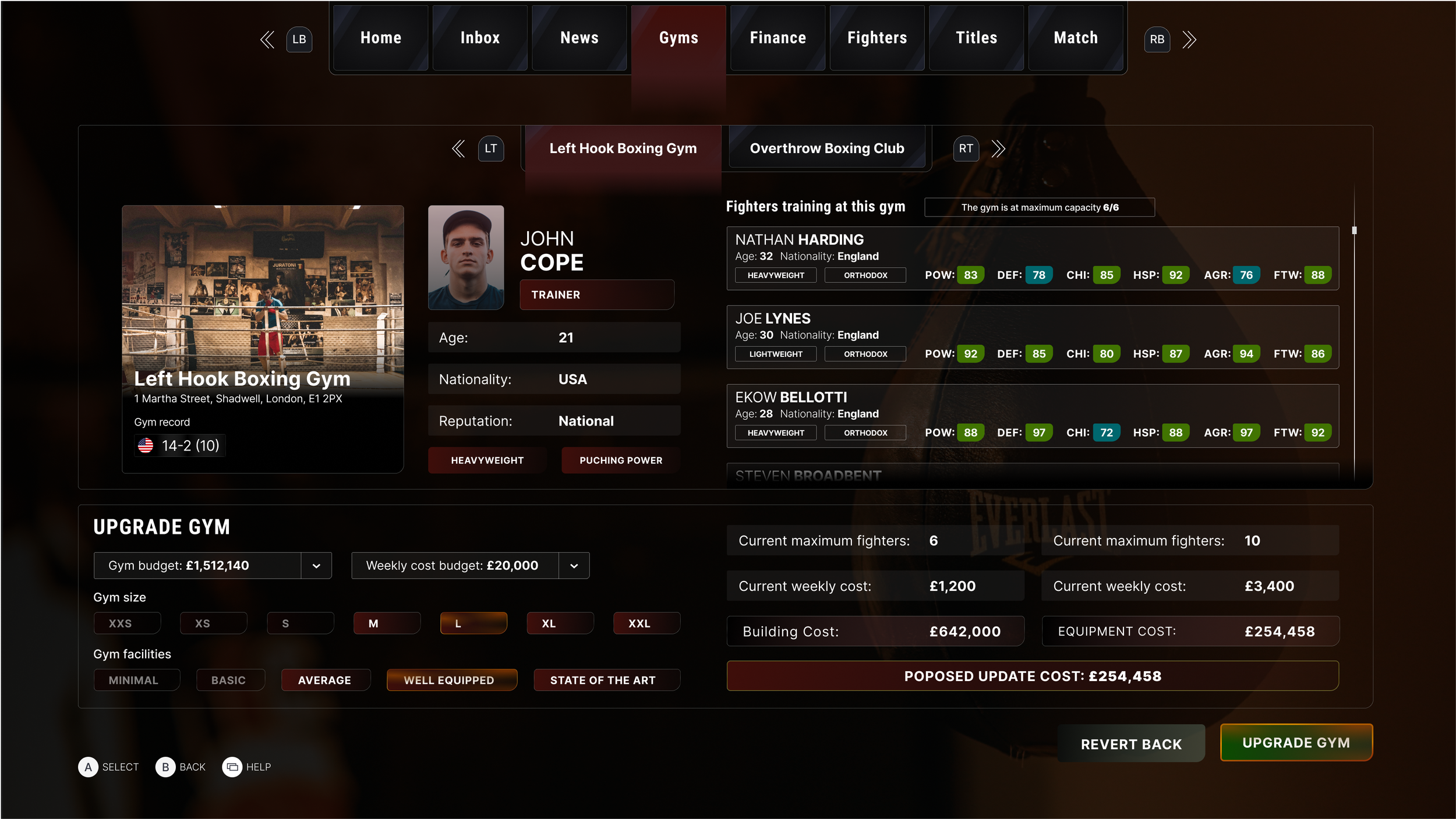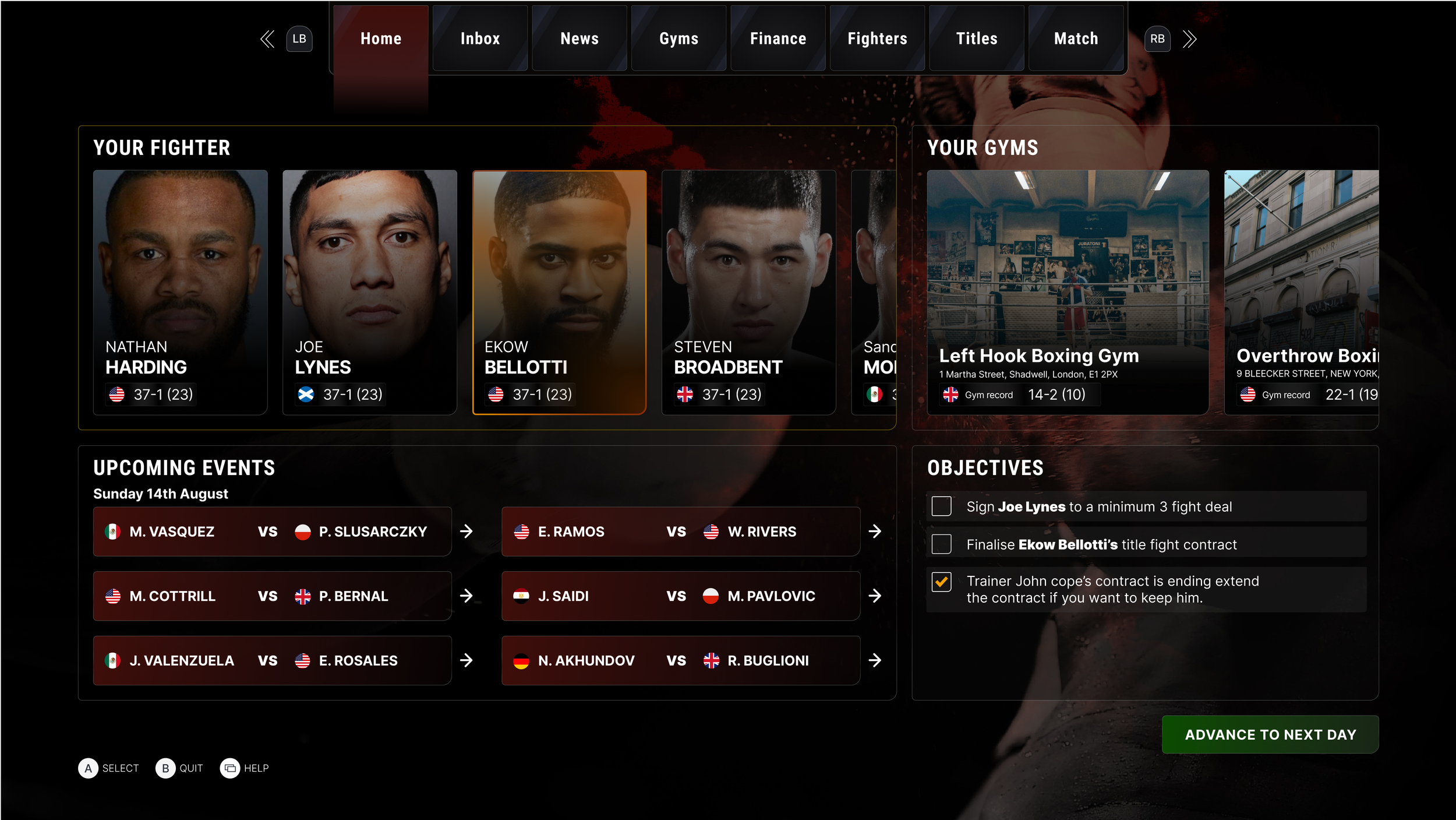 The user has an overview of all fighters they represent and the gyms they manage.