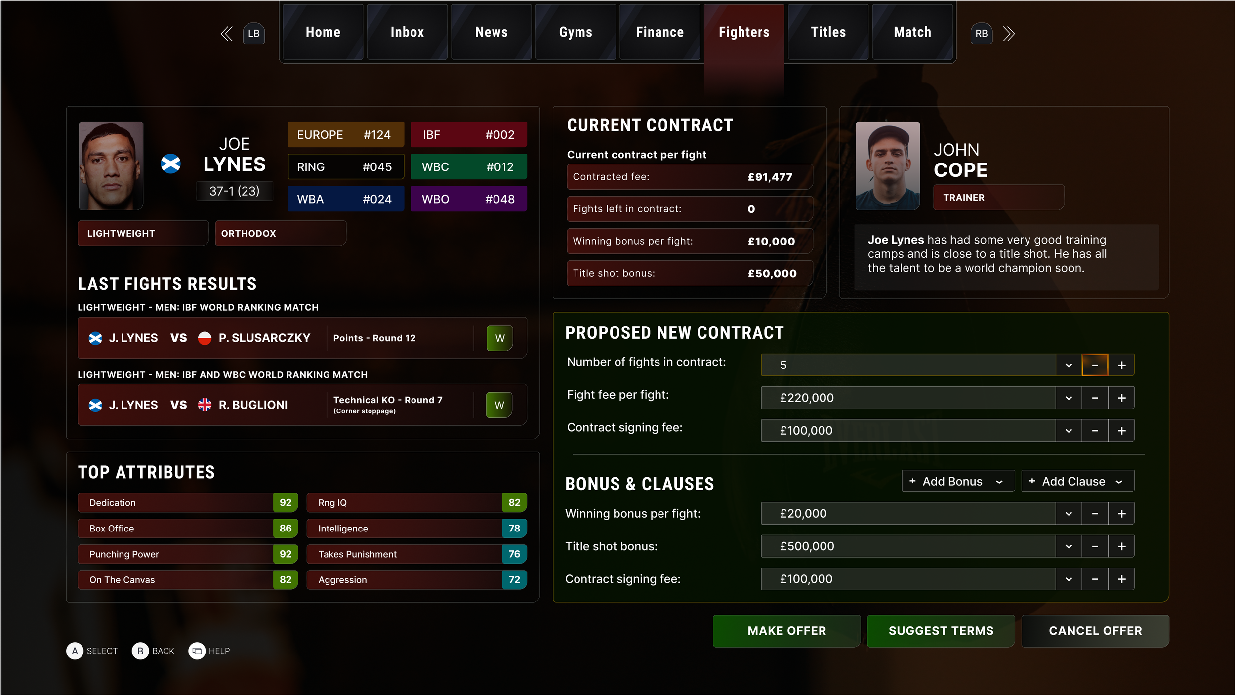 Users can negotiate a contract with a fighter, the user can see an overview of the fighter's top attributes and what the trainer thinks. This helps the user determine the contract they will submit.