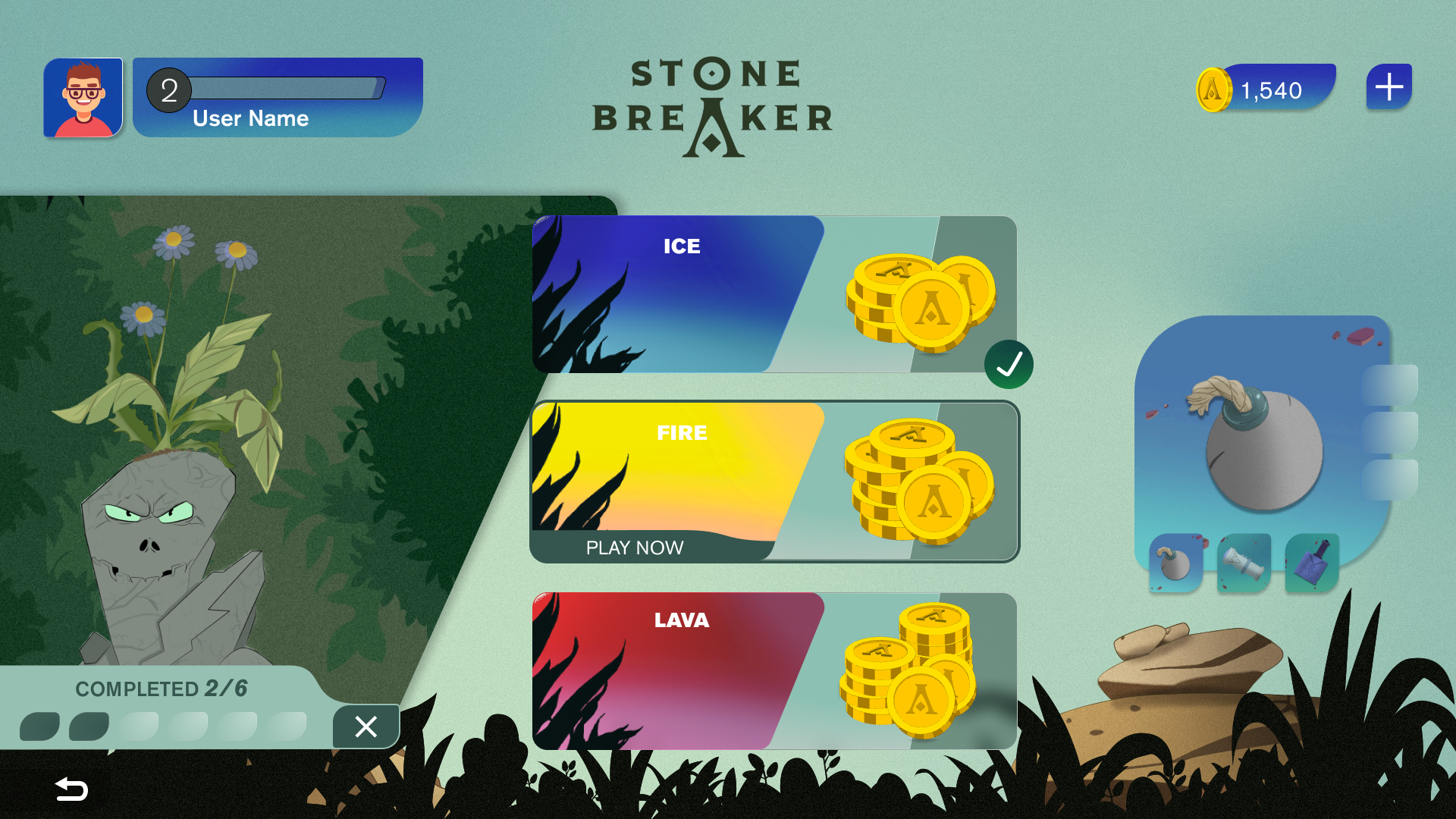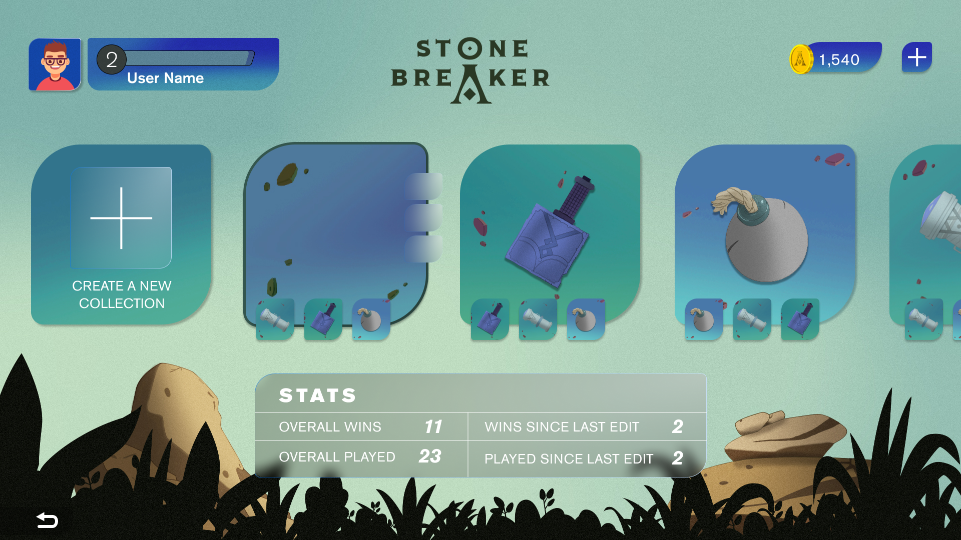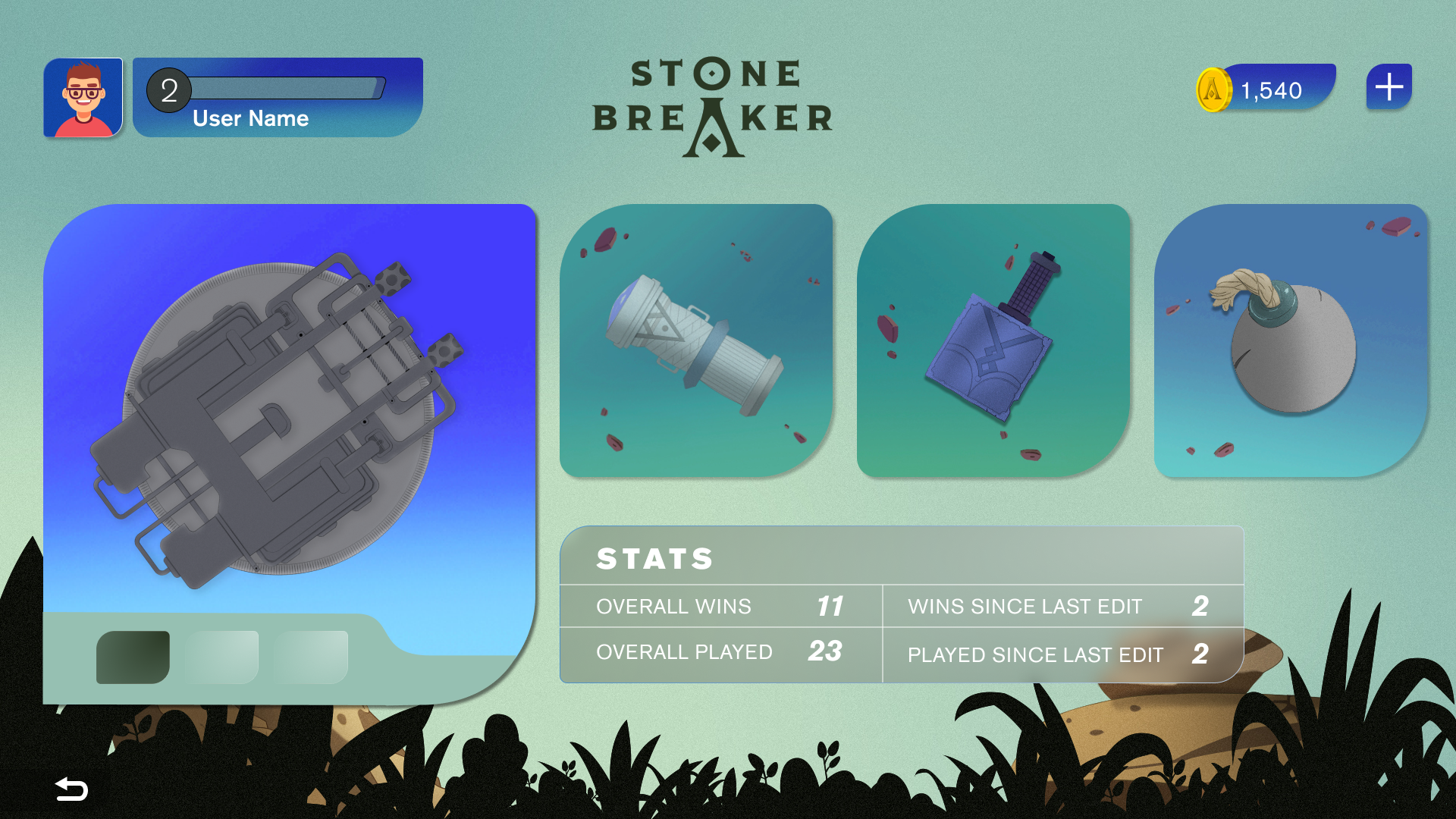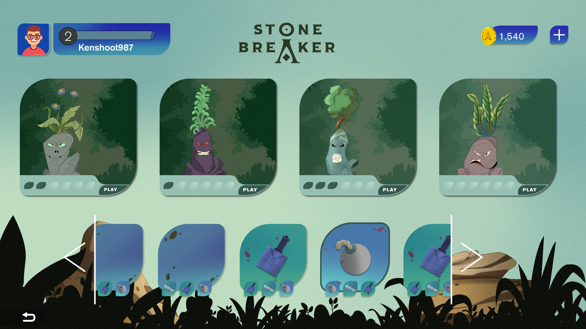 Stone breaker is a puzzle shooting game where you fire bullets at anthropomorphic shapes to clear them our the way and accumulating points by retrieving the bullets in the high scoring buckets. Each block requires a large number of hits to remove, and the fun is rebounding your stream of bullets to just the right so they hit multiple blocks at once. It's a low pressure puzzle game with a focus on colour and fun as much as skill.