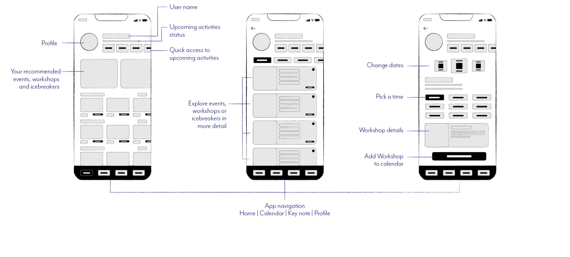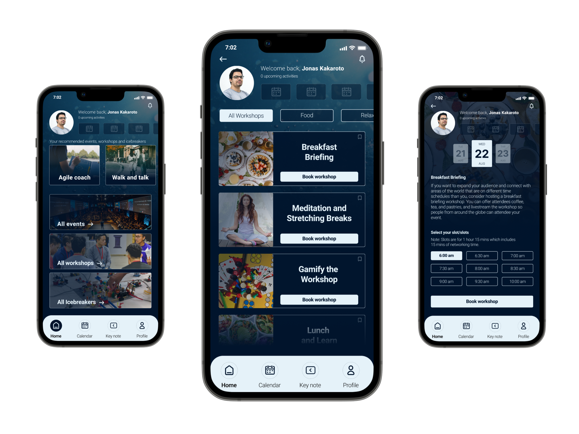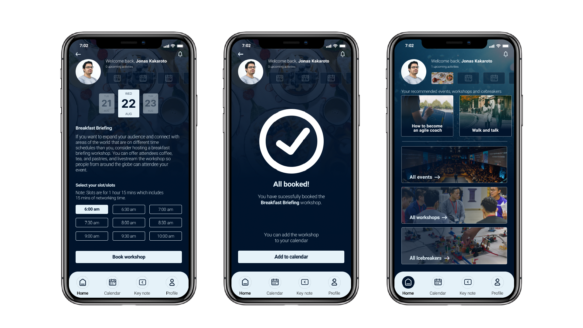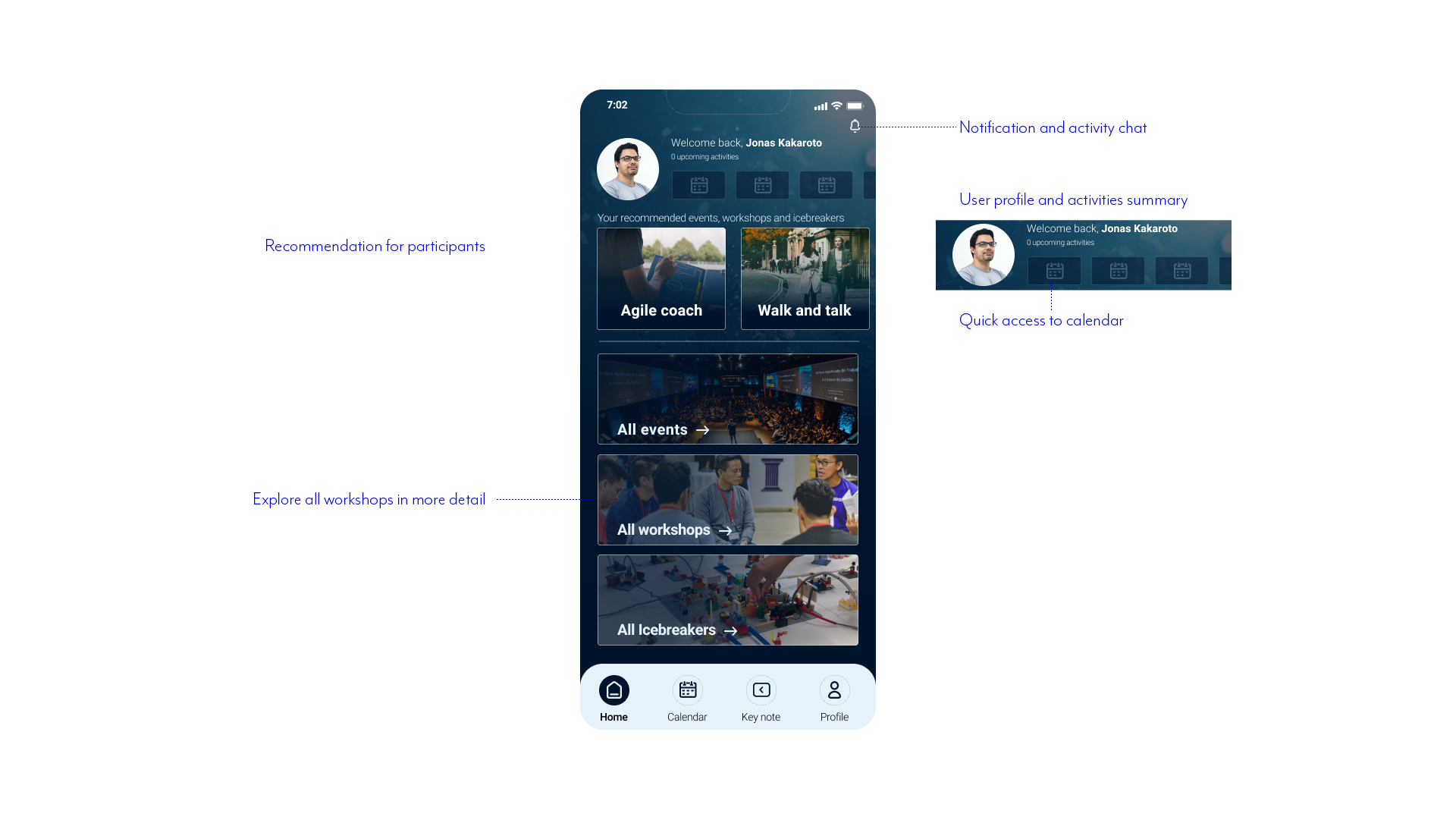 Home screen the user gets a summary of upcoming activities and can explore events, workshops and icebreakers.