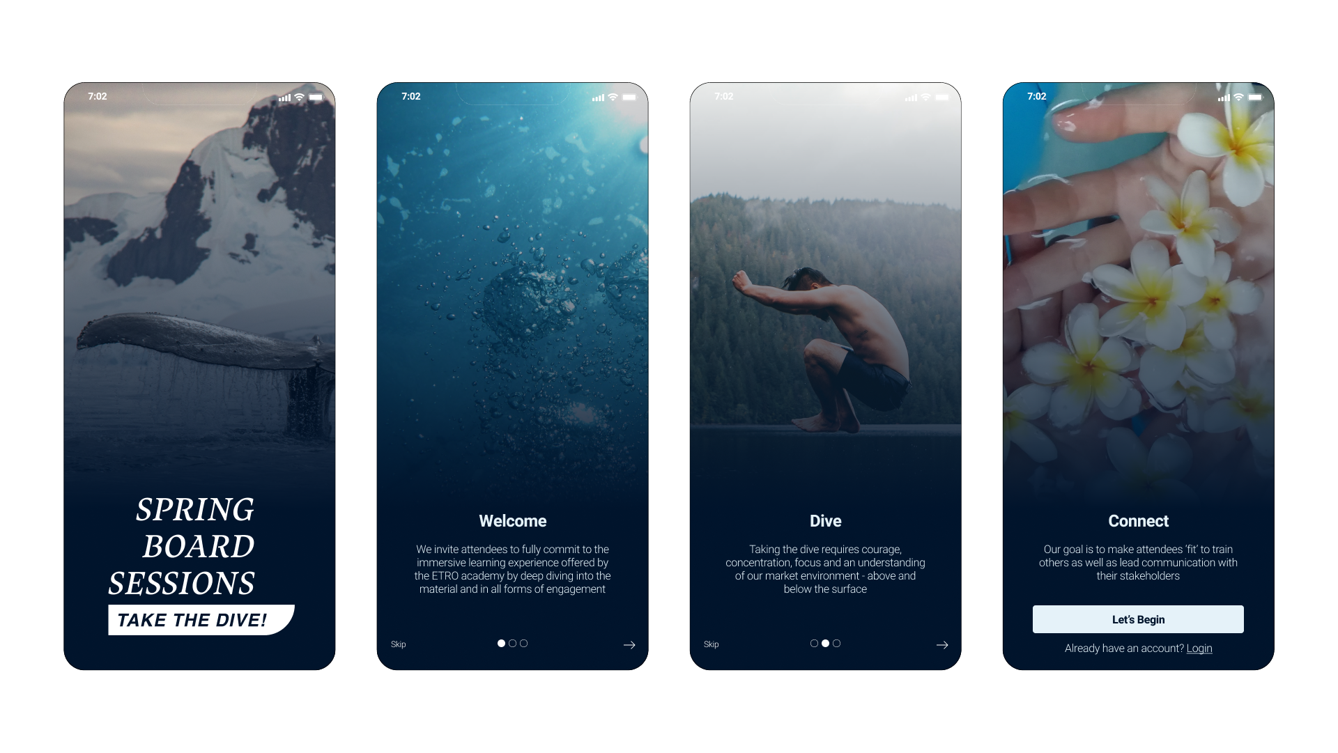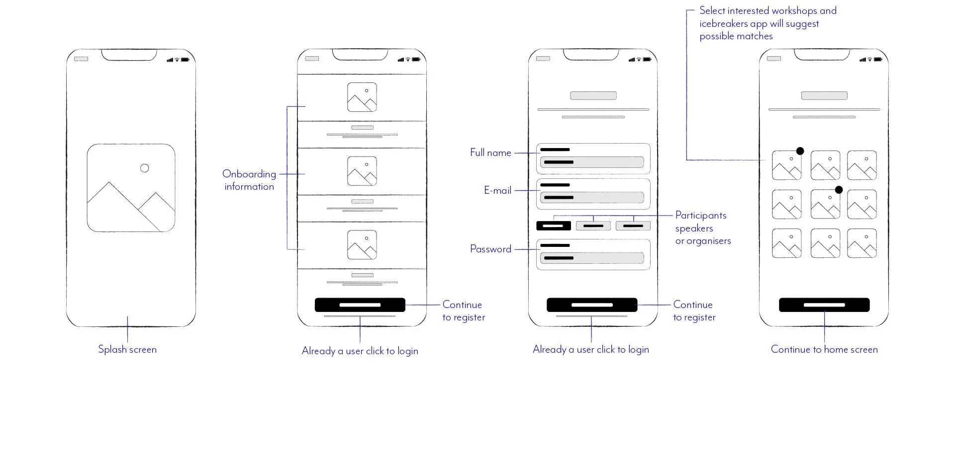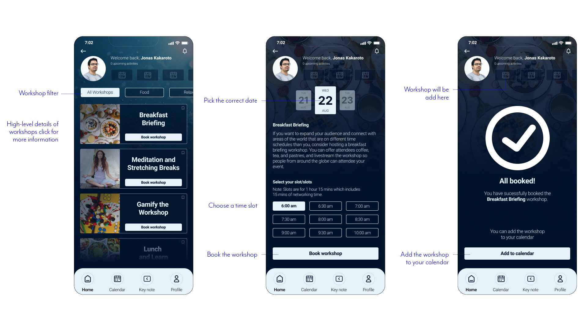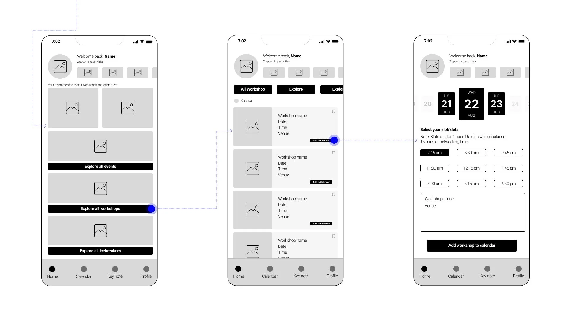 Home screen the user gets a summary of upcoming activities and can explore events, workshops and icebreakers.