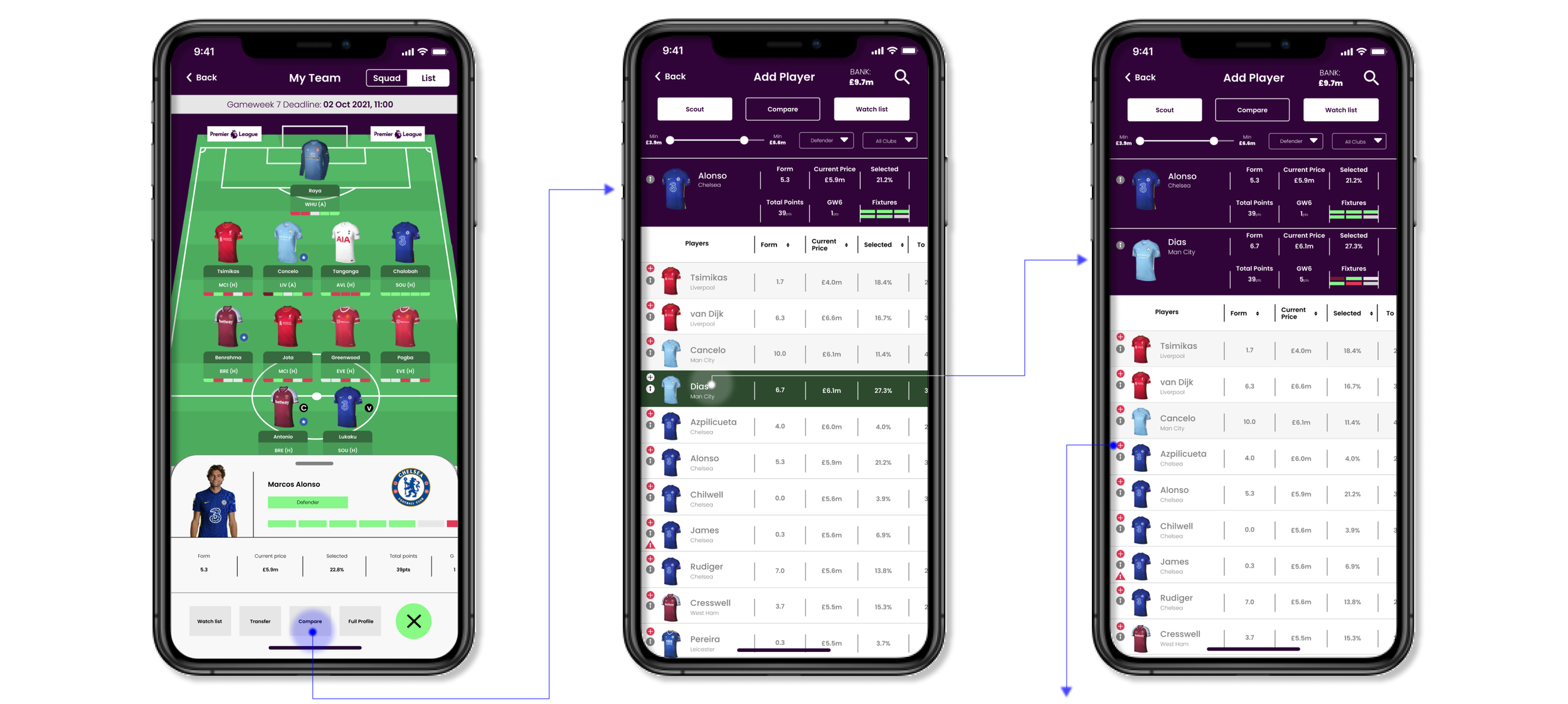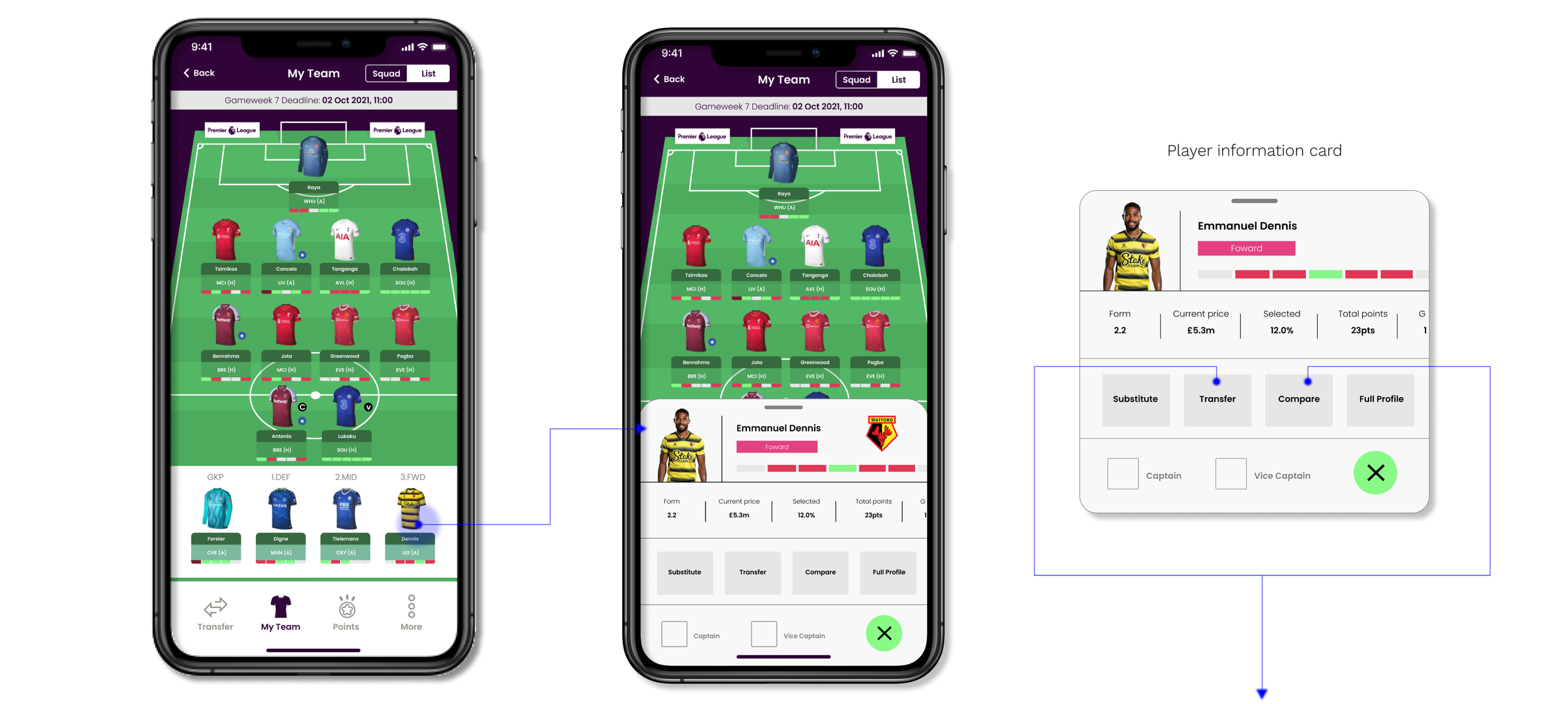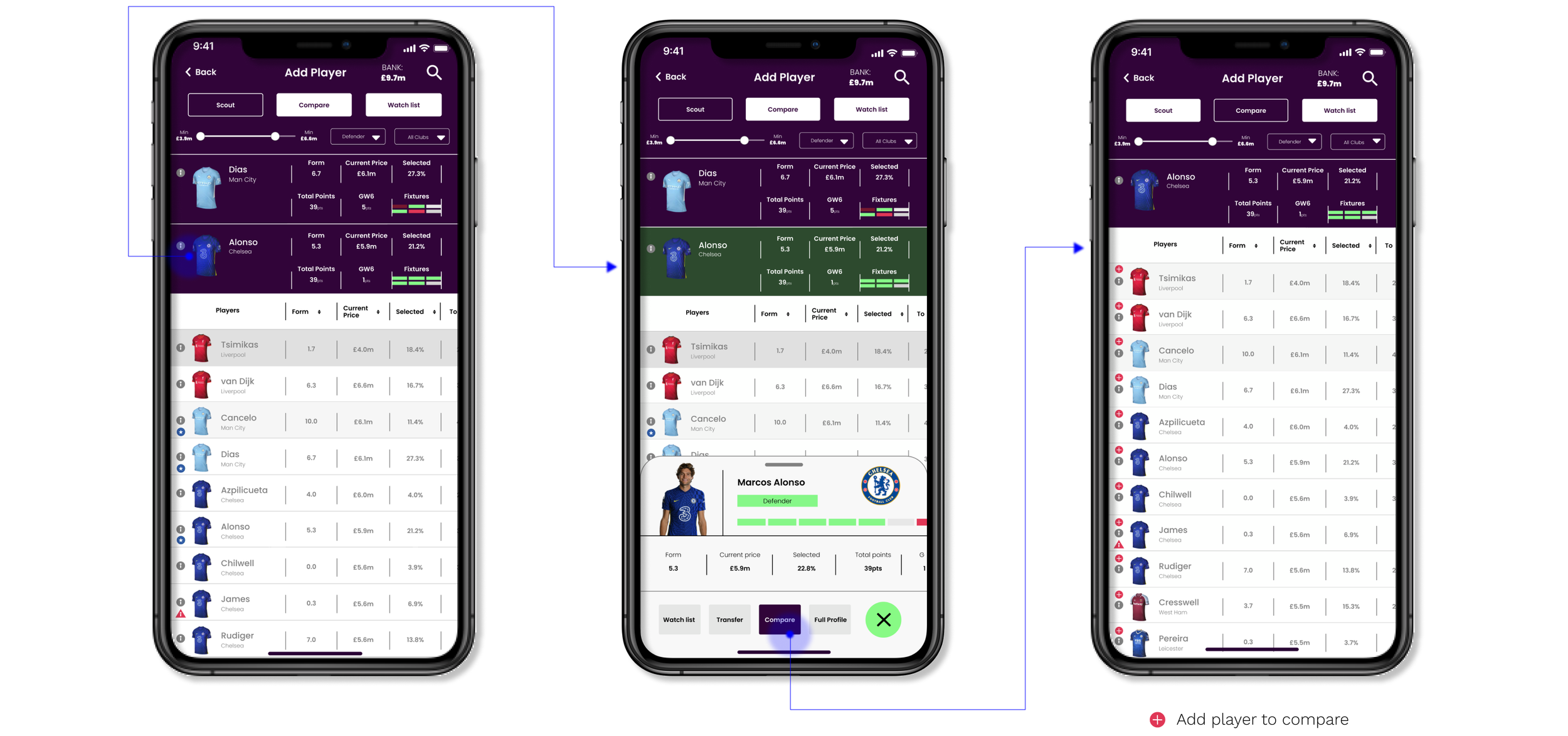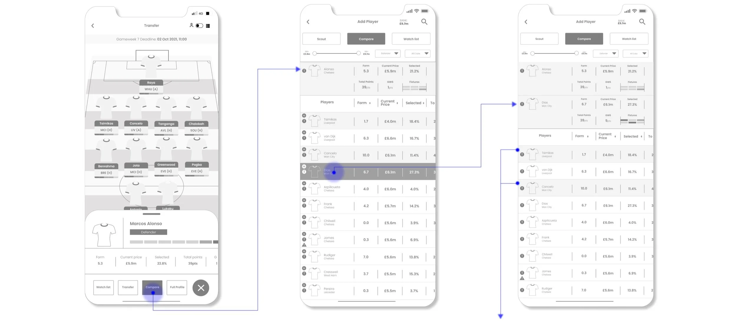 By adding a compare and transfer button in the player info card, the number of steps currently needed can be reduced. In the existing design, the user will need to navigate away from this page to use both these functions.