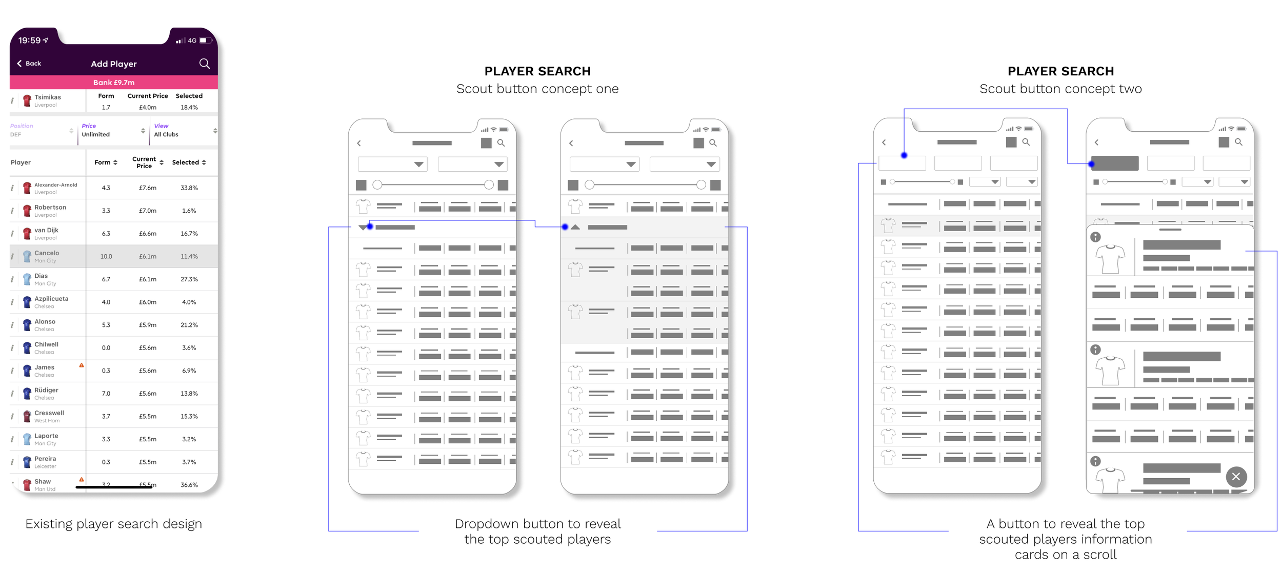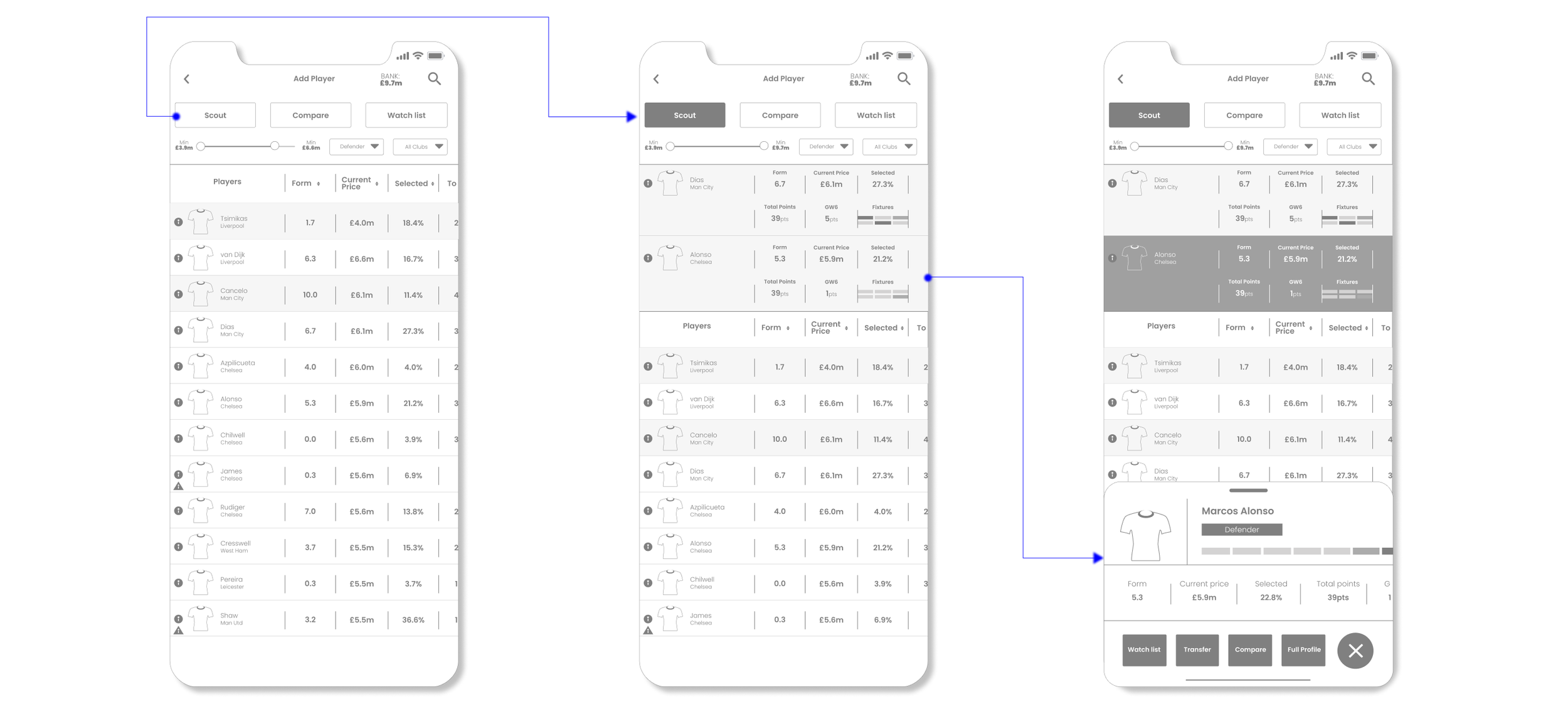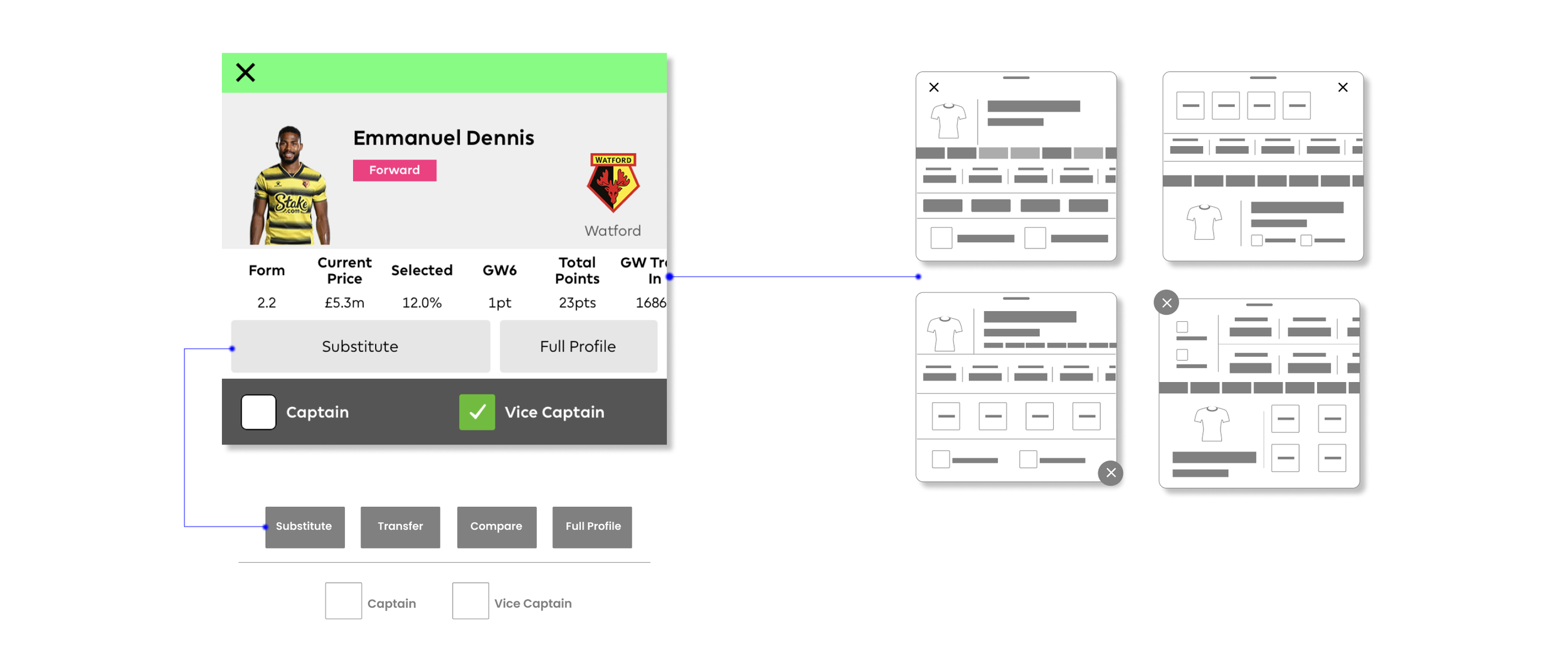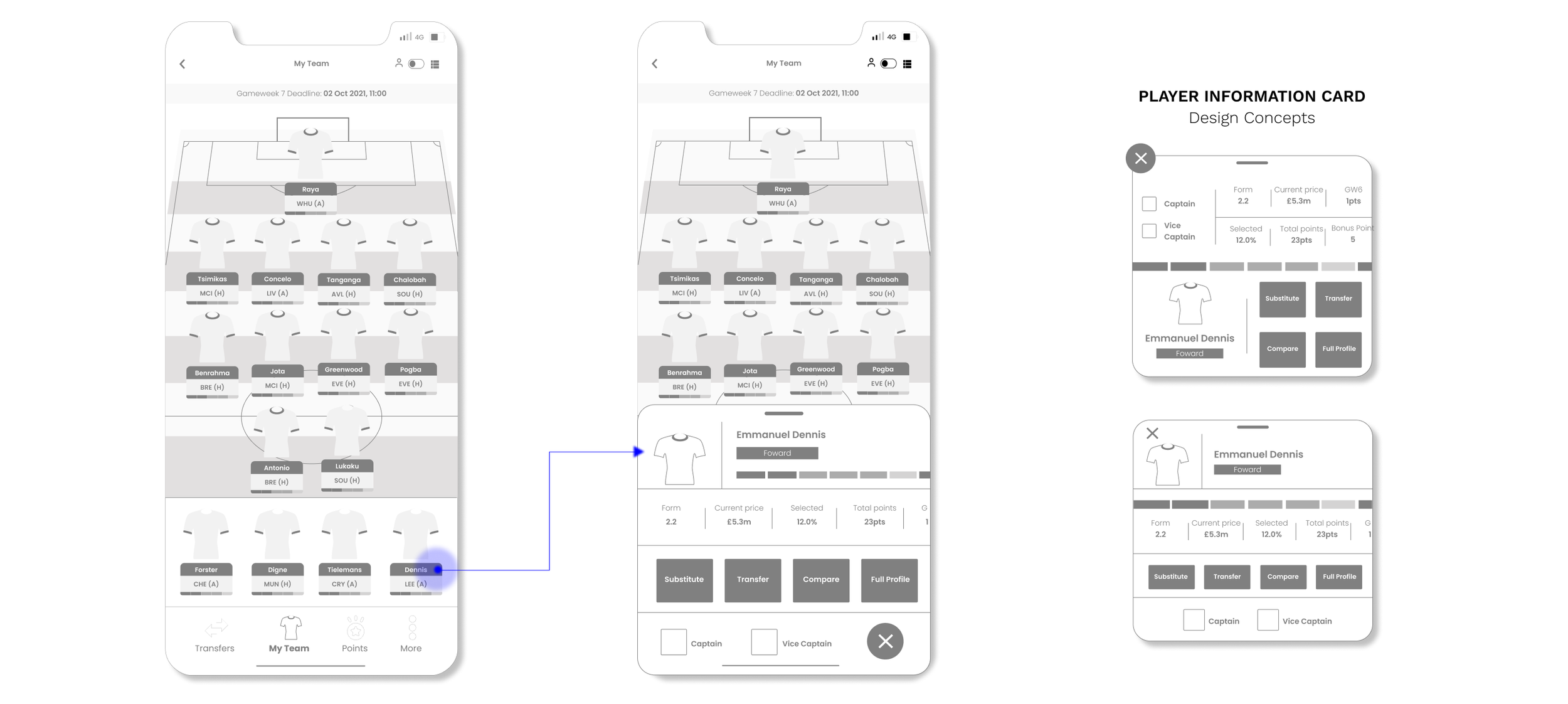 By adding a compare and transfer button in the player info card, the number of steps currently needed can be reduced. In the existing design, the user will need to navigate away from this page to use both these functions.