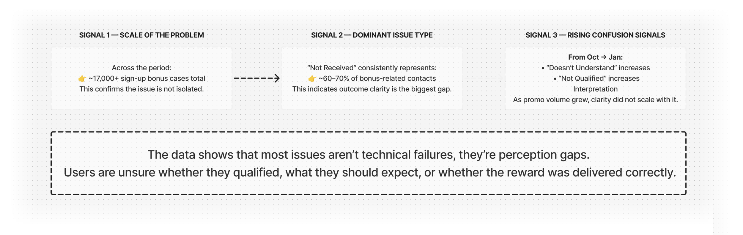 Support data showed a sustained decline in bonus-related queries following rollout, particularly in the largest category of confusion-driven contacts.