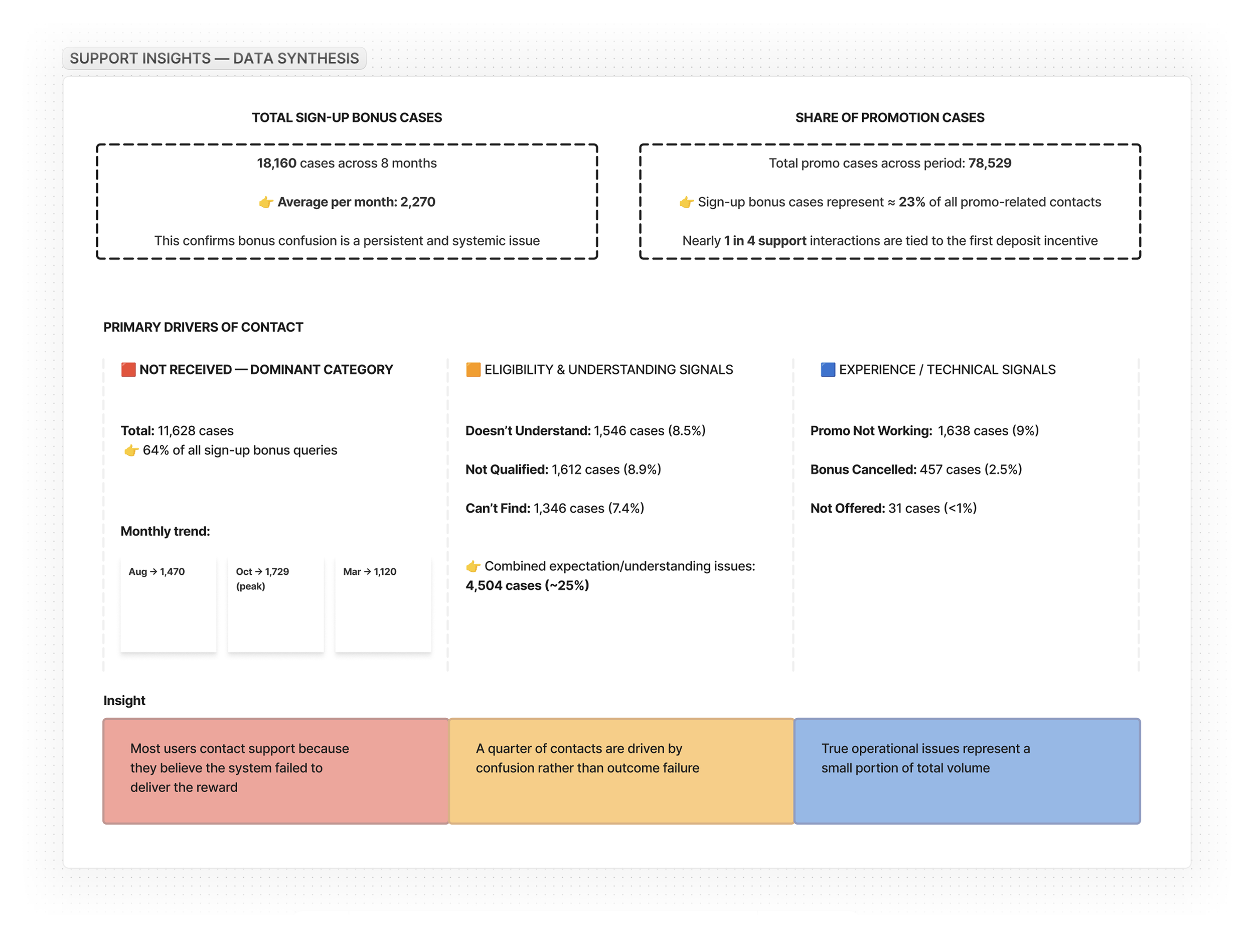 While some cases were genuine eligibility issues, the majority stemmed from unclear expectations around how bonuses worked. Secondary themes around eligibility, wagering requirements, and activation suggested the problem wasn’t isolated errors but a broader clarity gap in the deposit experience.