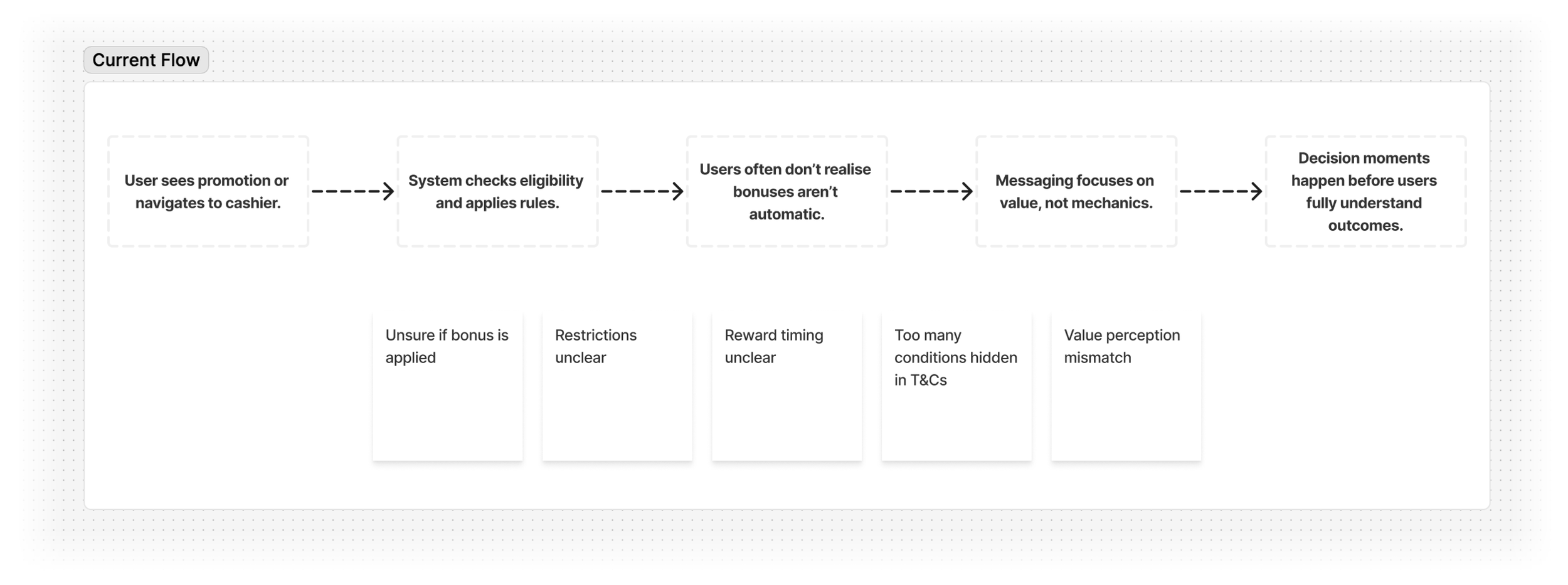 Mapping the bonus journey clarified the system’s complexity, revealing where expectations diverged from reality and where clarity was needed. This understanding shaped the front-end experience around clearer expectations and visible outcomes.