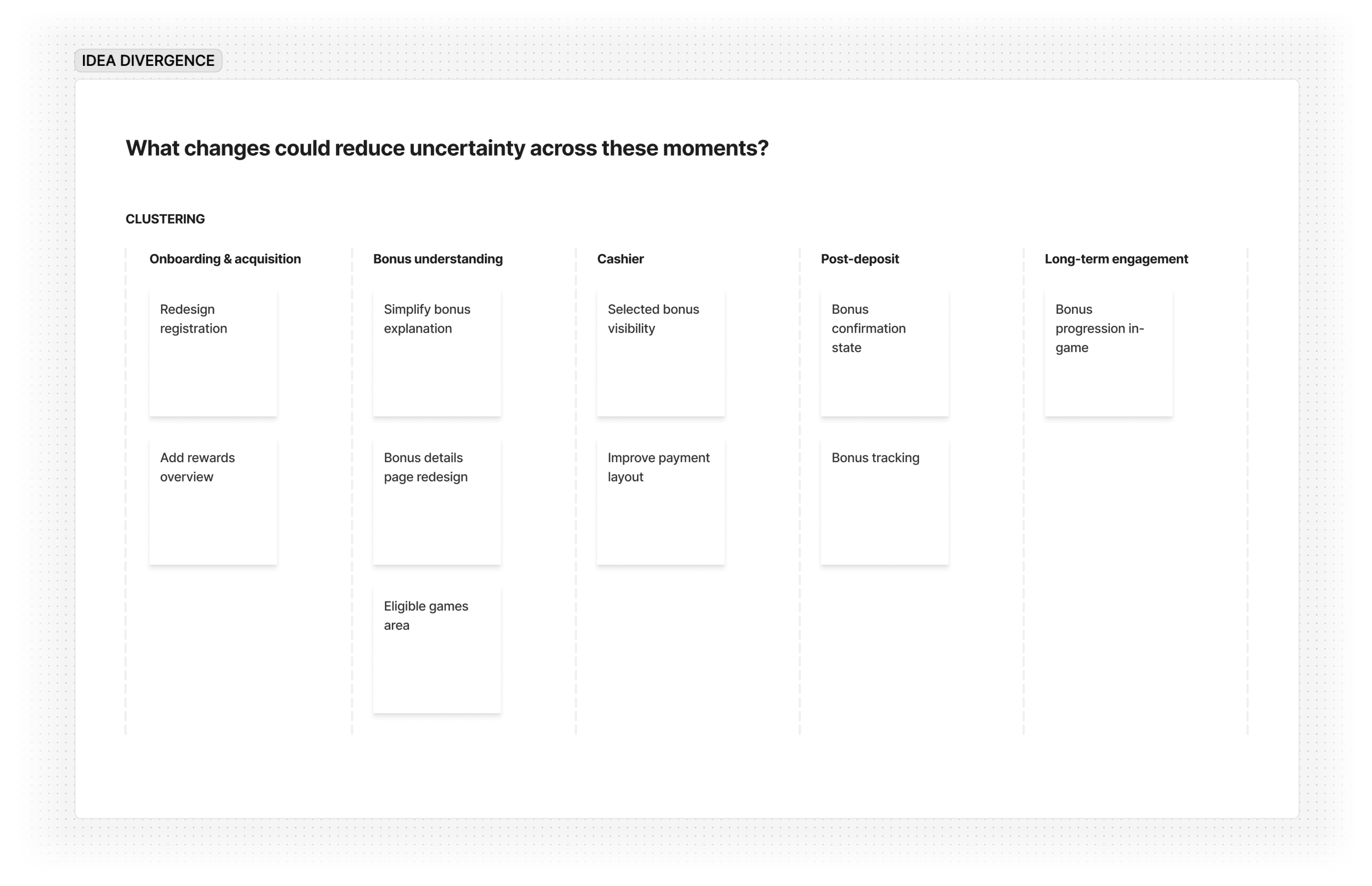 Improvements were explored across onboarding, bonus understanding, the cashier, and post-deposit feedback, but only some directly influenced the decision to deposit.