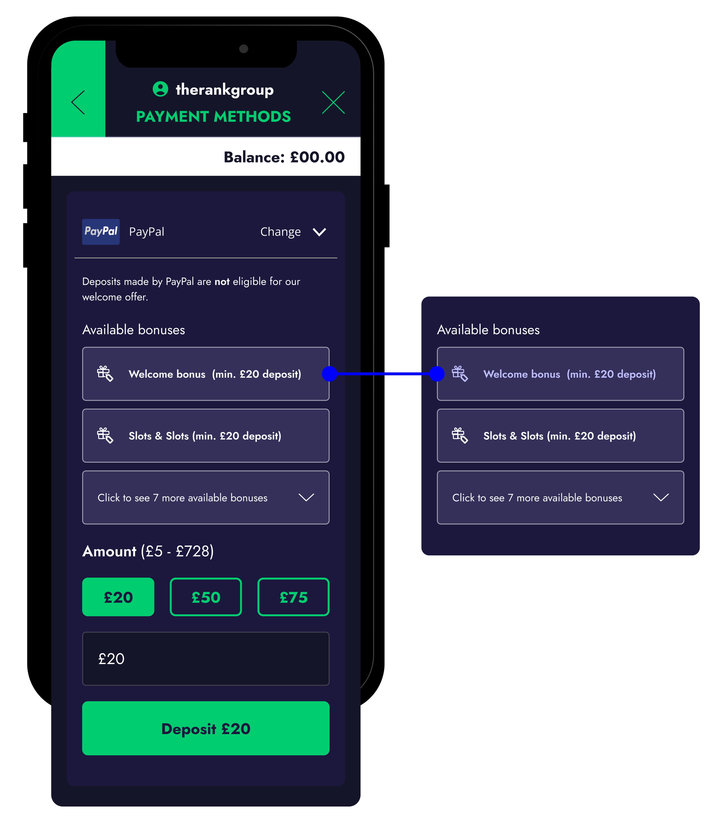 Previously, key restrictions, such as PayPal not being eligible for welcome or sign-up bonuses, were communicated only through a small line of copy above the bonus list, making them easy to miss at the point of decision.