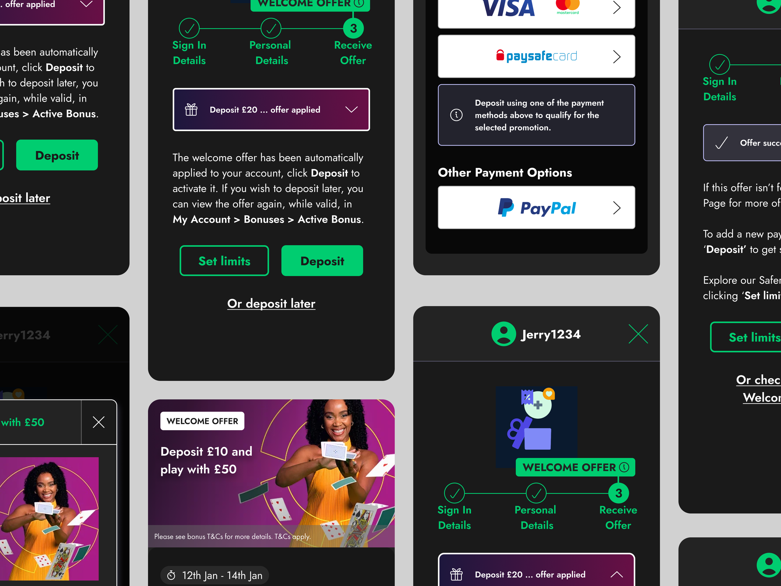 With backend updates to the COGS bonus engine, the selected bonus ID now persists throughout the entire journey. This enabled the experience to consistently surface the chosen promotion at every key decision point, removing ambiguity and reinforcing continuity. Users could review full bonus details and terms and conditions before committing to a deposit, ensuring expectations were set upfront and reducing post-deposit confusion.