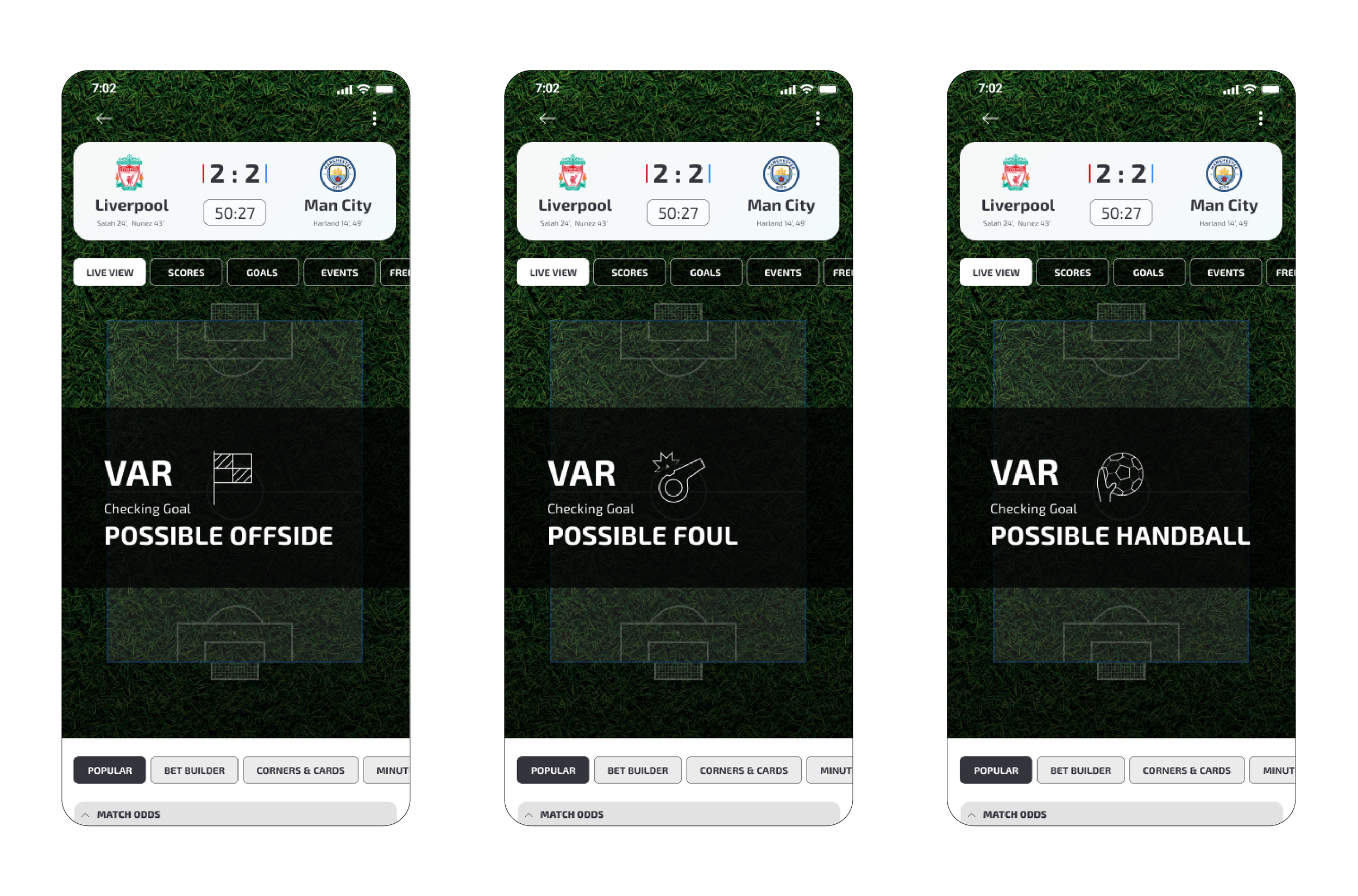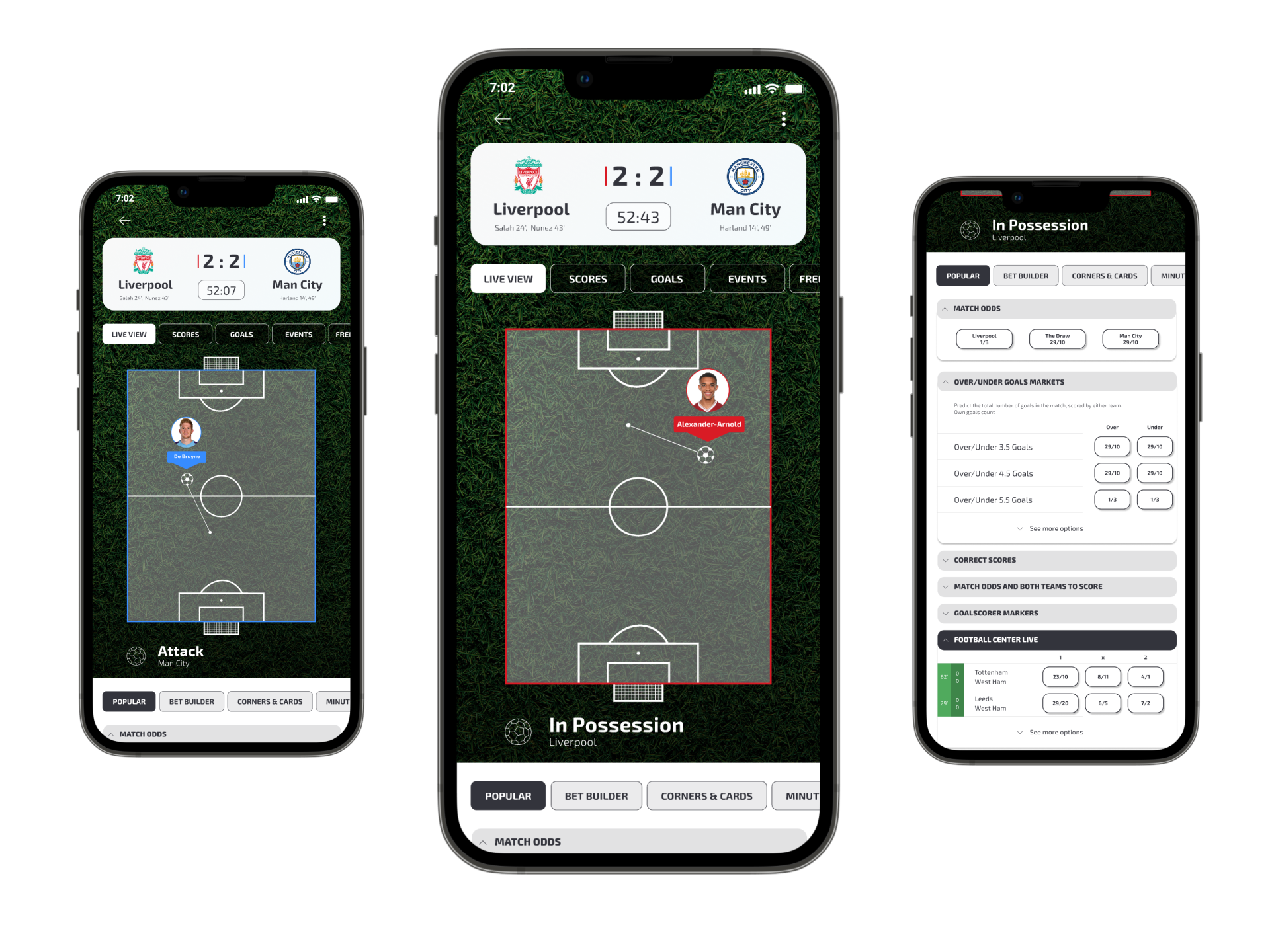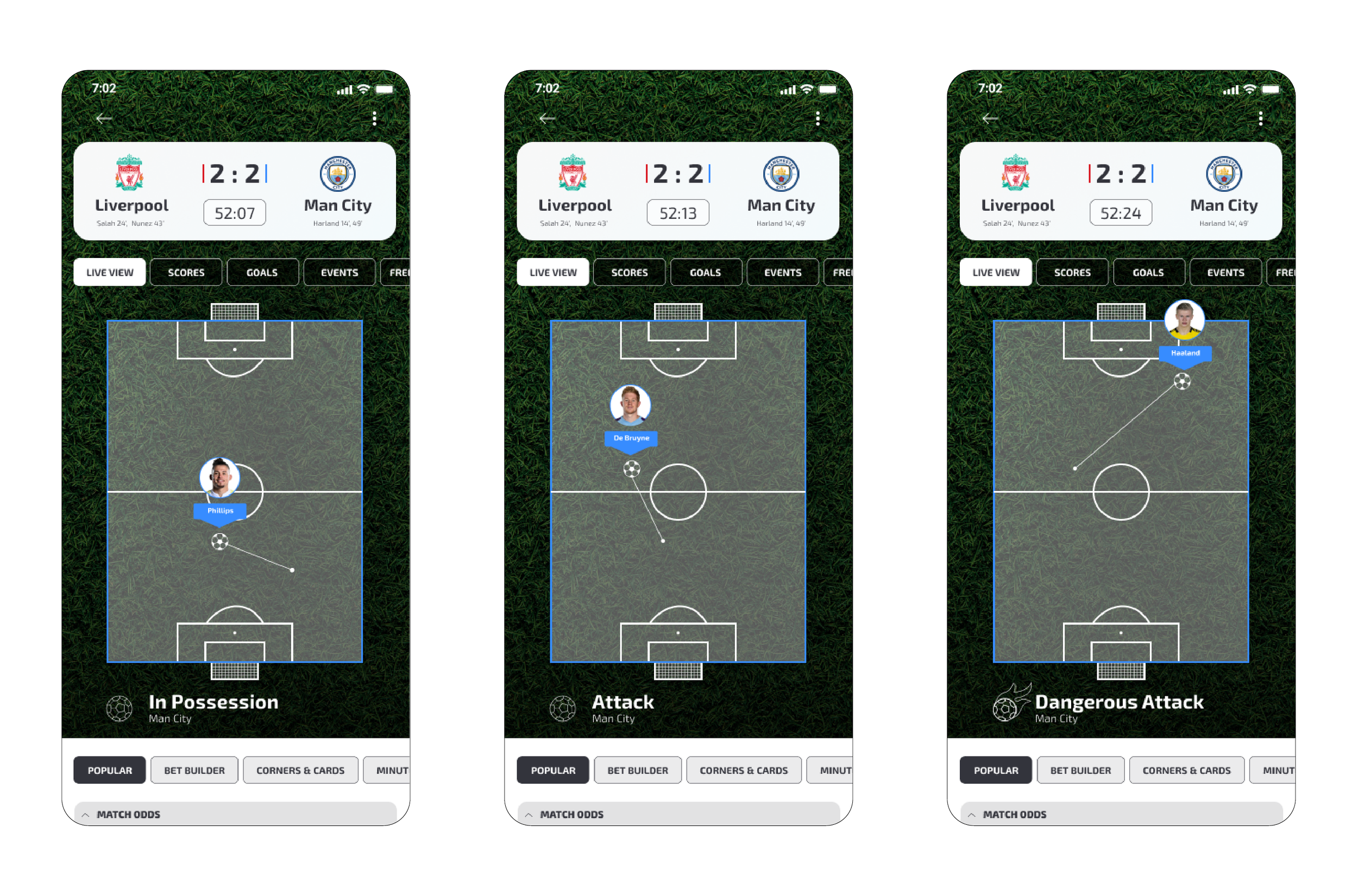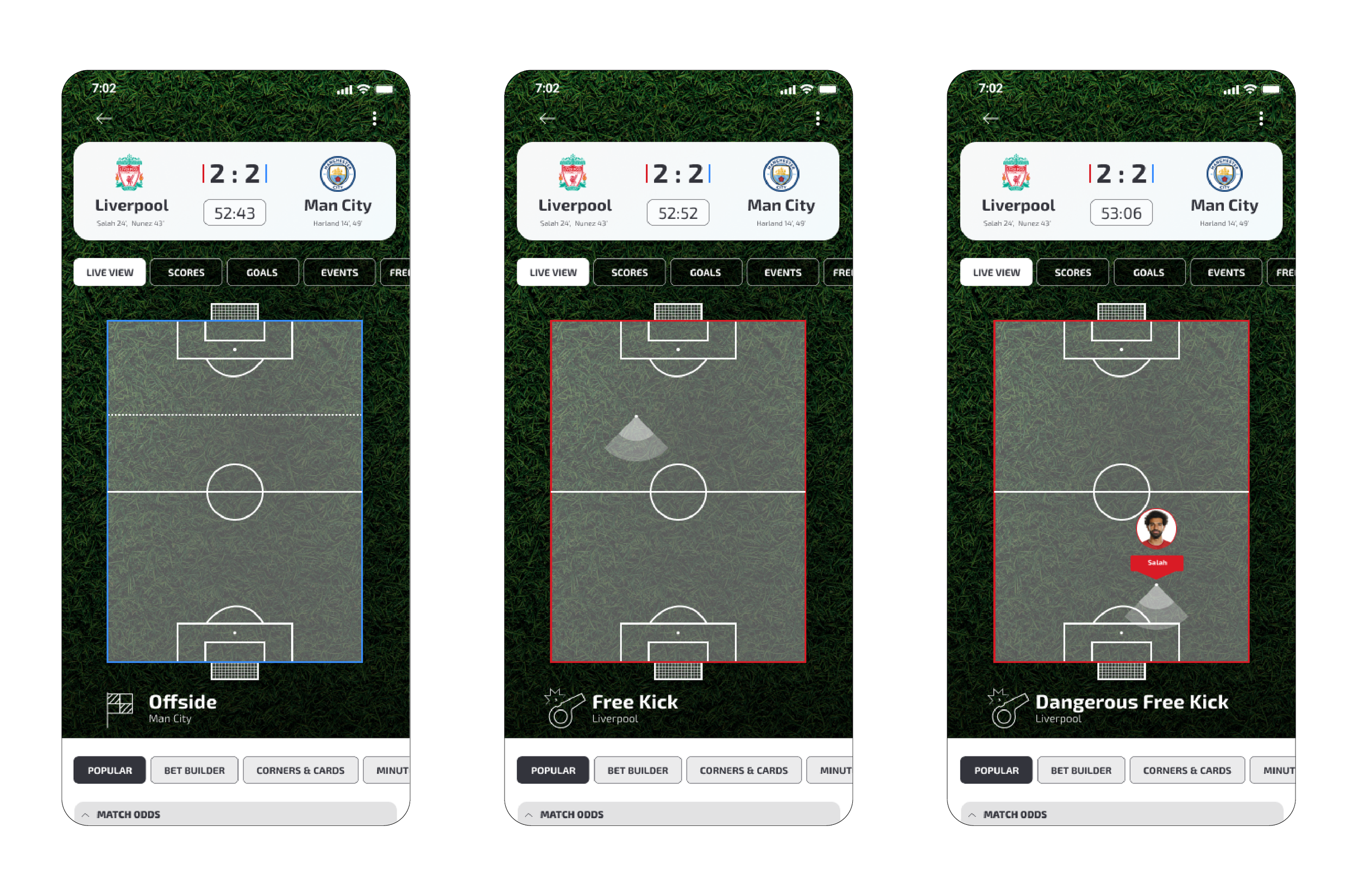 Using 3D cameras player positional data is now assessable, being able to identify where each player is on the pitch. This design visualises the data to give users an enriched experience when viewing an in-play football match.