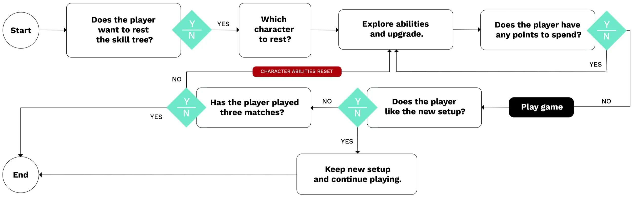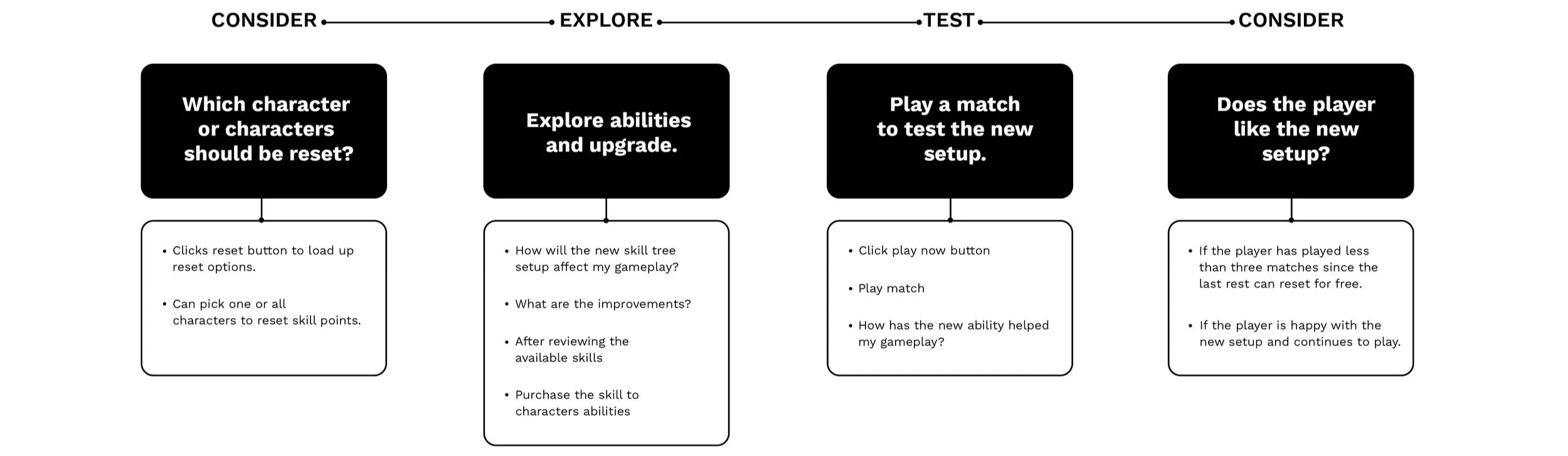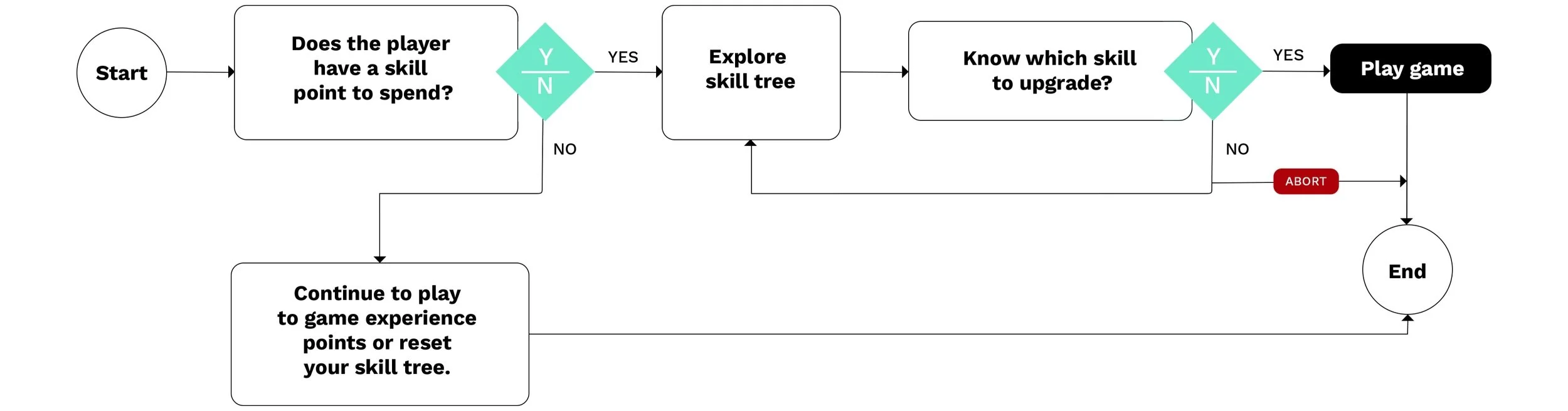 To understand how the user interacts with the skill tree, I focused on the 2 key tasks, which is the upgrade and character reset. I mapped user flow and user journey for these two tasks to identify potential blockers.