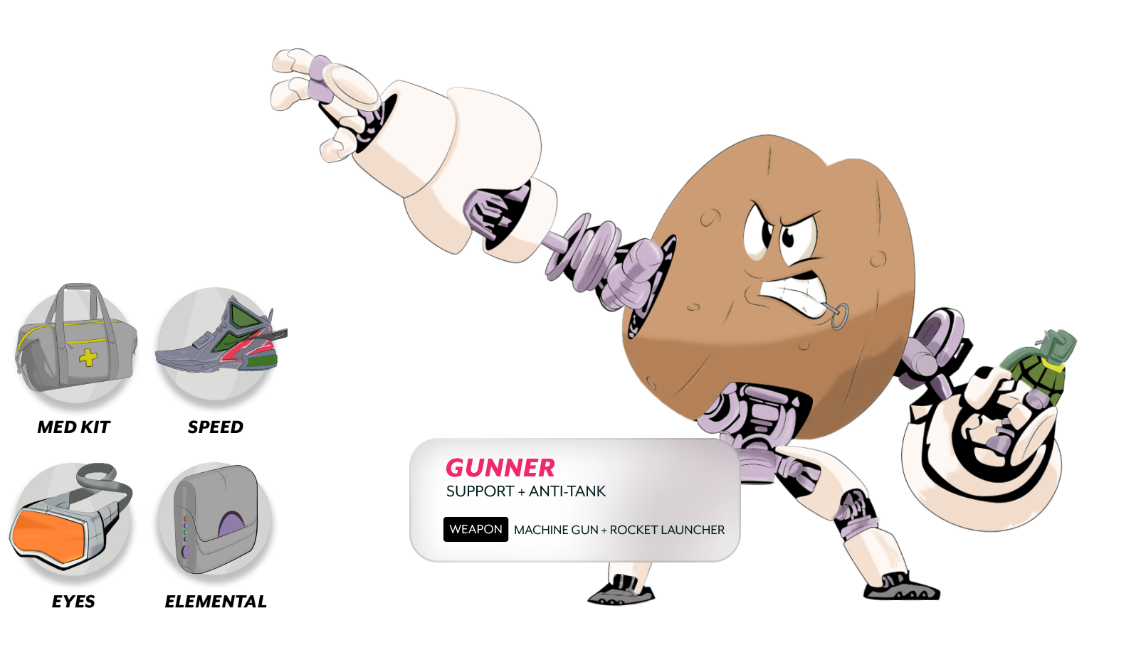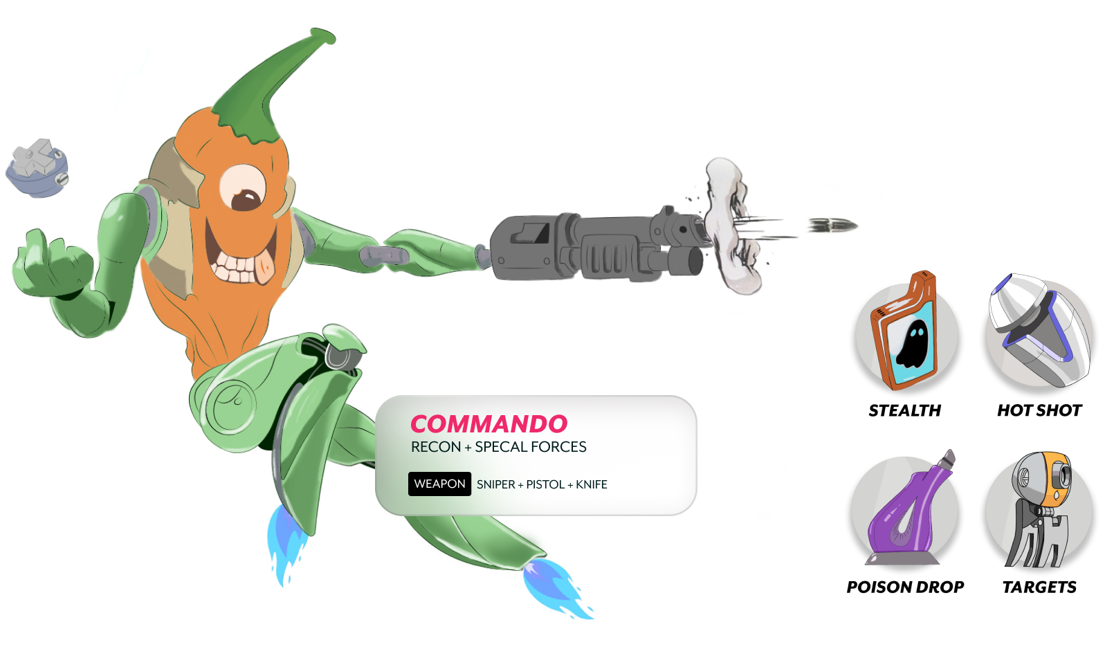 In Mad chilli: Revenge of the roots the playable characters are split into two teams Chillis or Roots. Each team has three character classes and the class have four skill branches. The player can then build abilities from the skill tree to adapt a unique playing style.