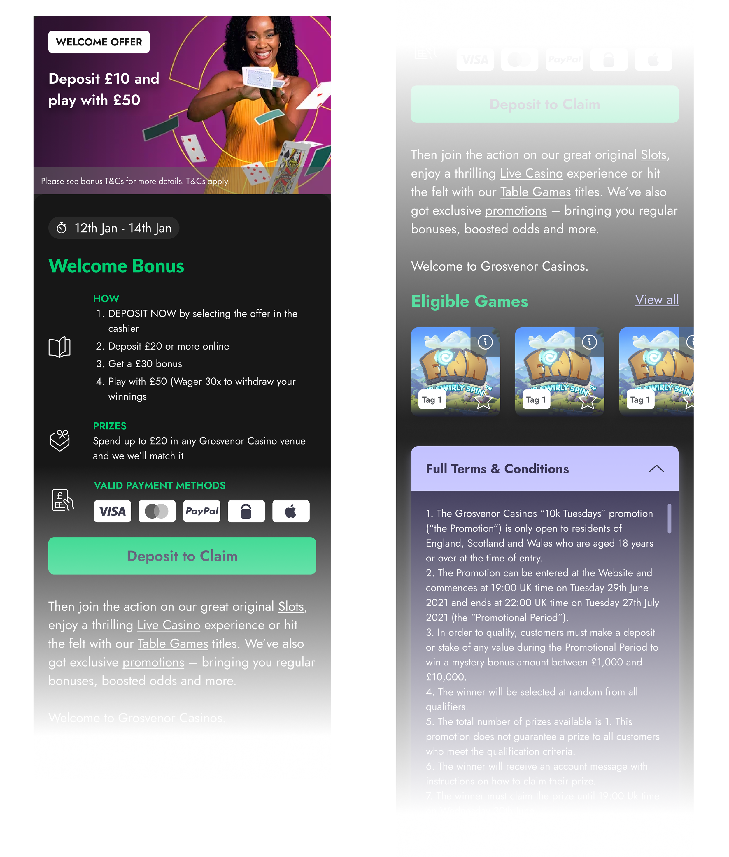 With backend updates to the COGS bonus engine, the selected bonus ID now persists throughout the entire journey. This enabled the experience to consistently surface the chosen promotion at every key decision point, removing ambiguity and reinforcing continuity. Users could review full bonus details and terms and conditions before committing to a deposit, ensuring expectations were set upfront and reducing post-deposit confusion.